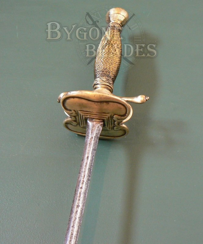 The squared brass guard is of typical bi-lobed form and is firm. The baluster form grip is bound in twisted brass wire, which is intact and tight and terminates in a ball pommel. The hilt is in overall good condition, with some mild tarnish. The blade is firm in the hilt.