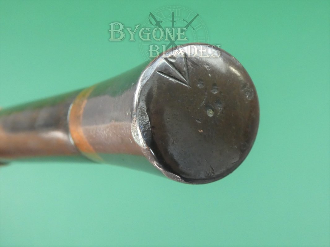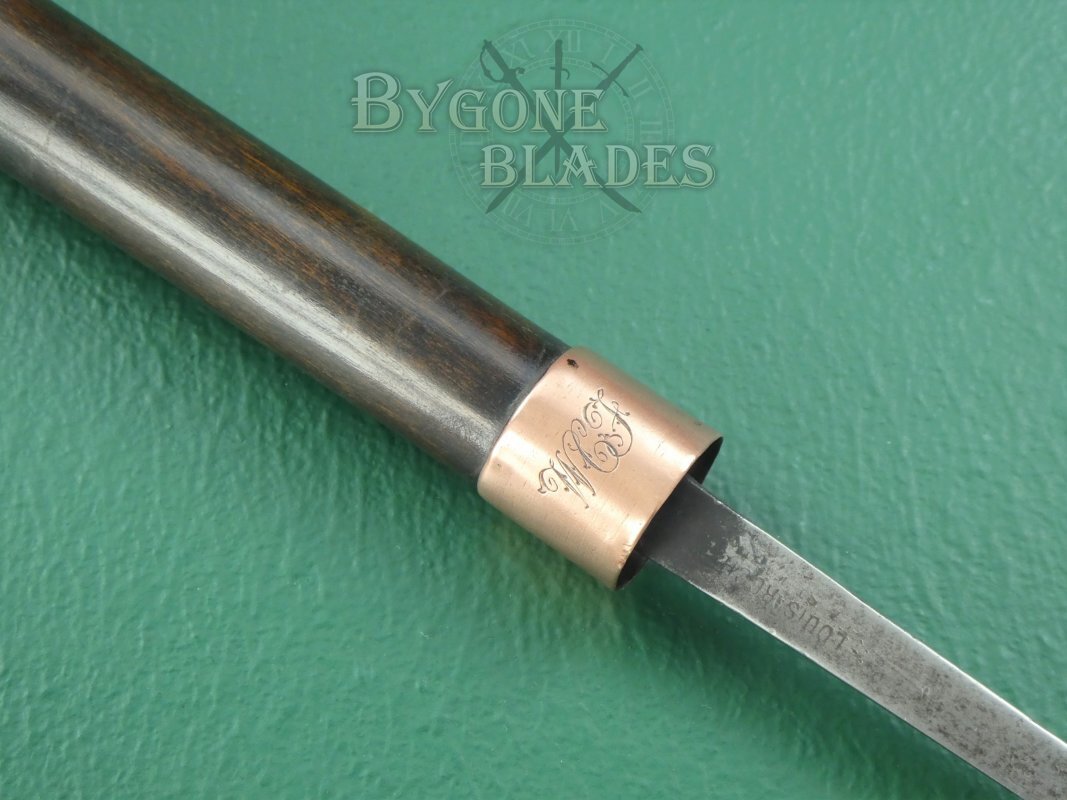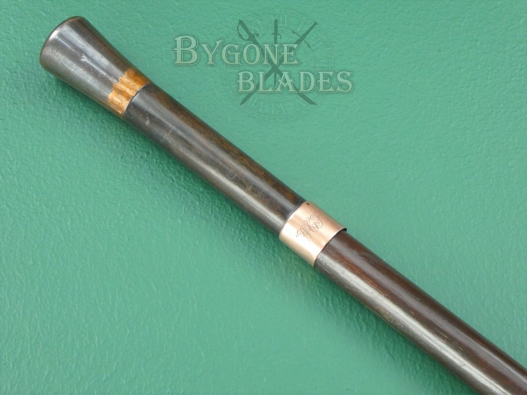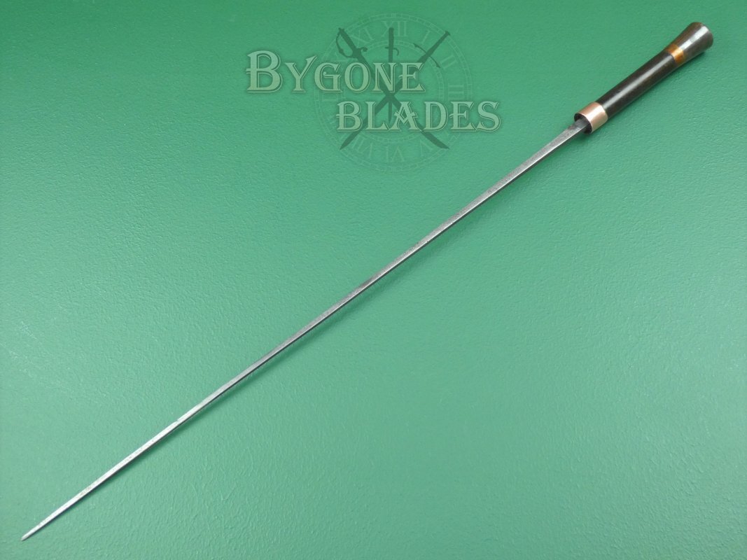 The 608mm thrusting blade tapers to a point and is in good condition. It sheathes smoothly within the body of the cane, fitting snugly without rattle or play. The base of the blade is stamped with the manufacturer’s details. The blade was made at St. Etienne, France although the cane appears to be British.