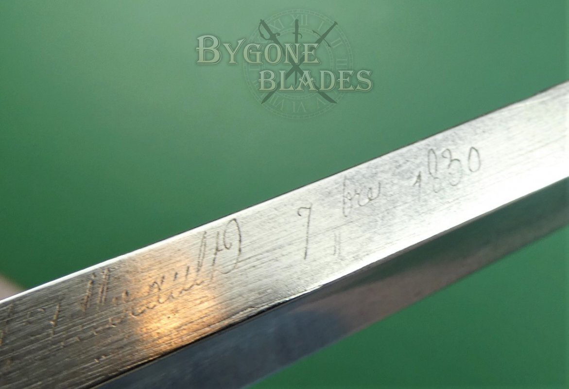 The spine is engraved with the date of manufacture and armoury details: Chatellerault, July 1830. The ricasso of the blade is stamped with two Chatellerault inspection poincon.
