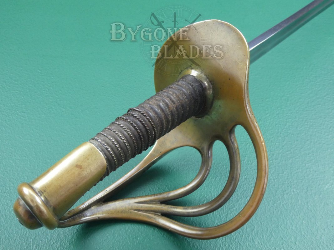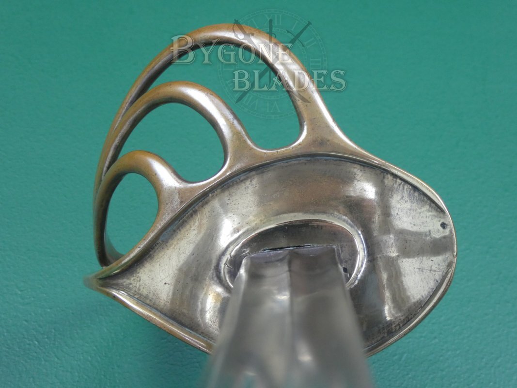 The four barred guard is in great condition and is stamped with various poincon and armoury marks that indicate a date of about 1870. The leather wrapped grip is in good condition with partial loss to the wire. The blade is firm in the hilt.