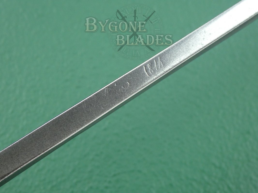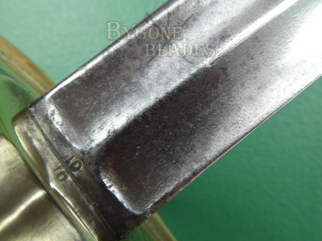 The 960mm straight, single edged blade has a flat spine and twin fullers that continue to the spear point. Originally the blade would have had a hatchet point but around 1815-1816, the original points of these swords were ground to spear points. The blade was made at the Klingenthal factory in June 1814 and bears the Klingenthal inspection stamp of François Louis Lobstein, a Klingenthal inspector since 1804. The other poincon have been polished out. The spine is faintly engraved with the Klingenthal armoury name and the clear, but worn manufacture date.