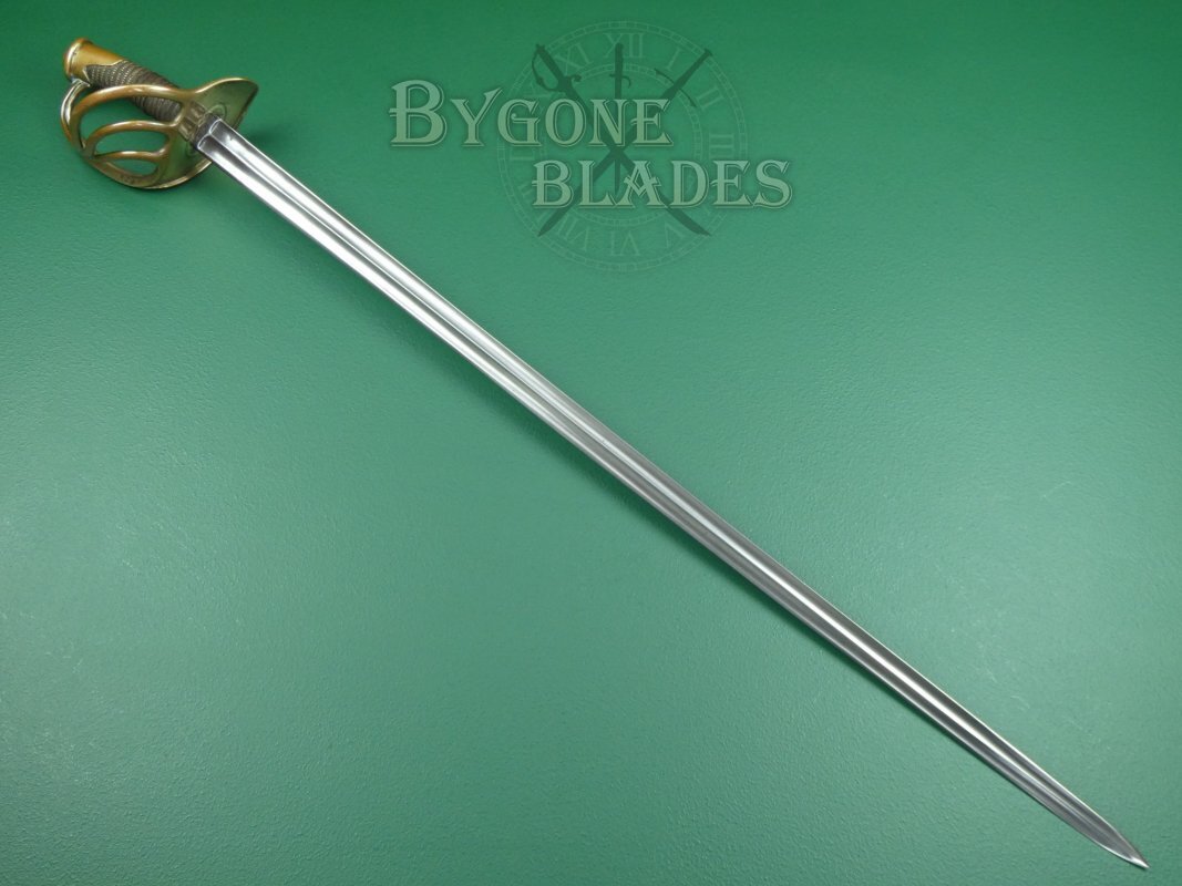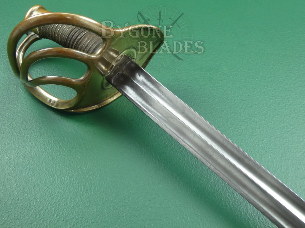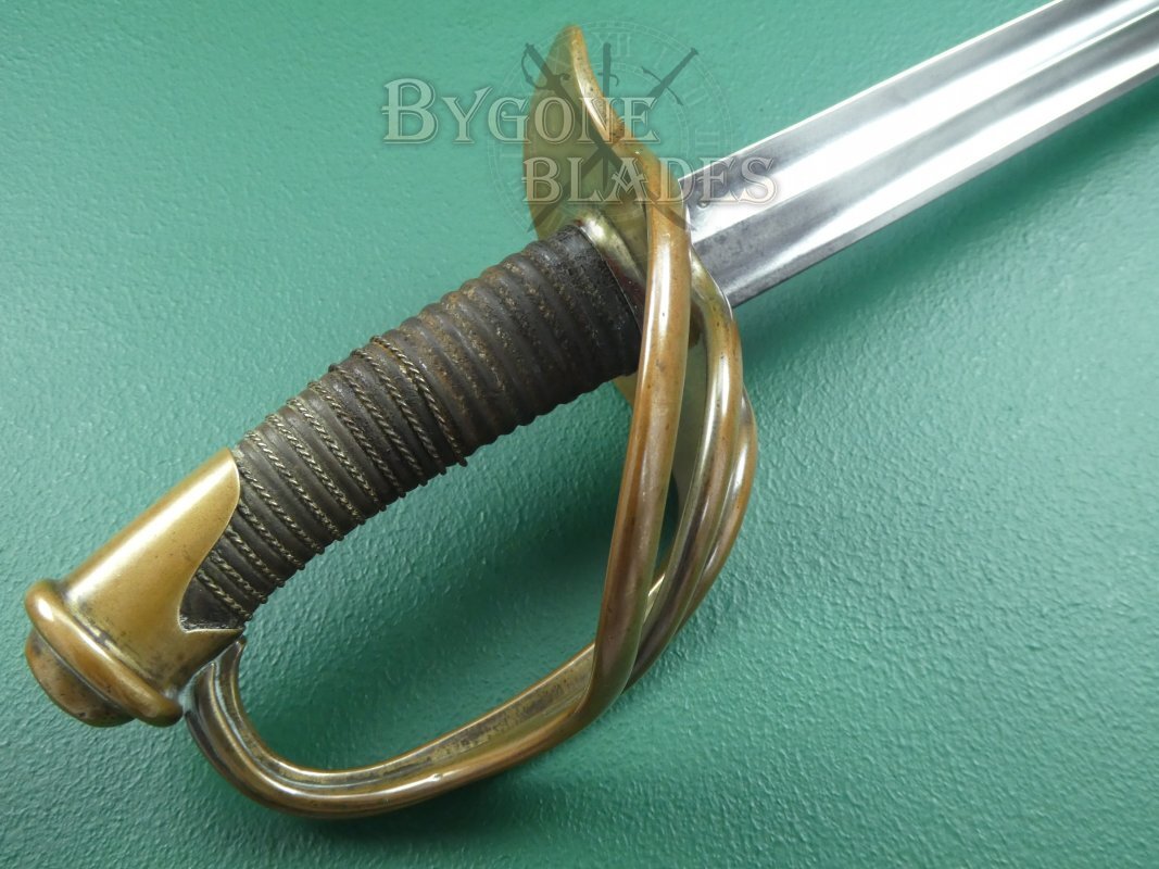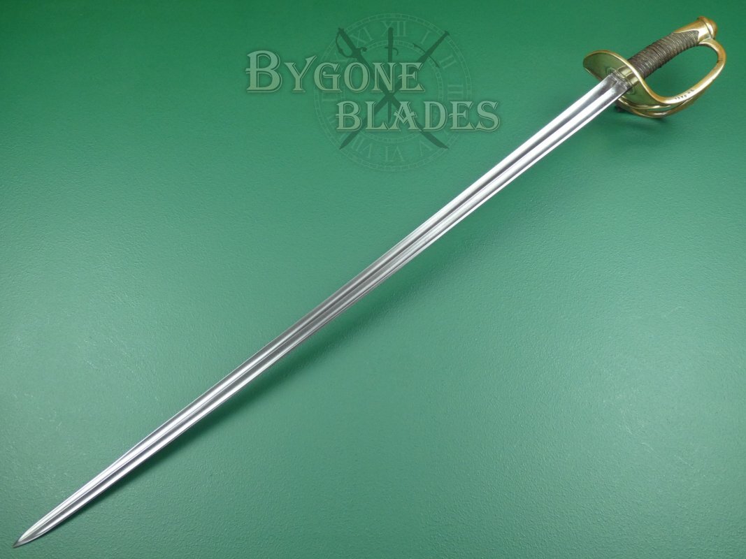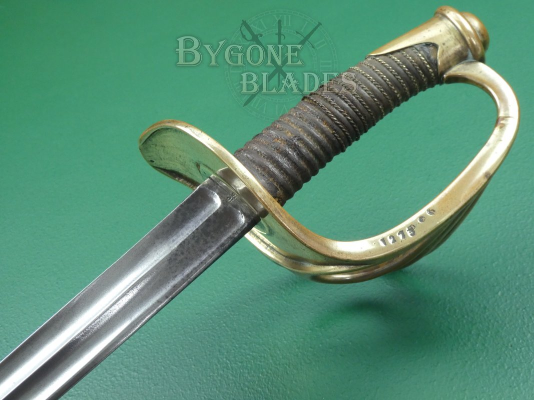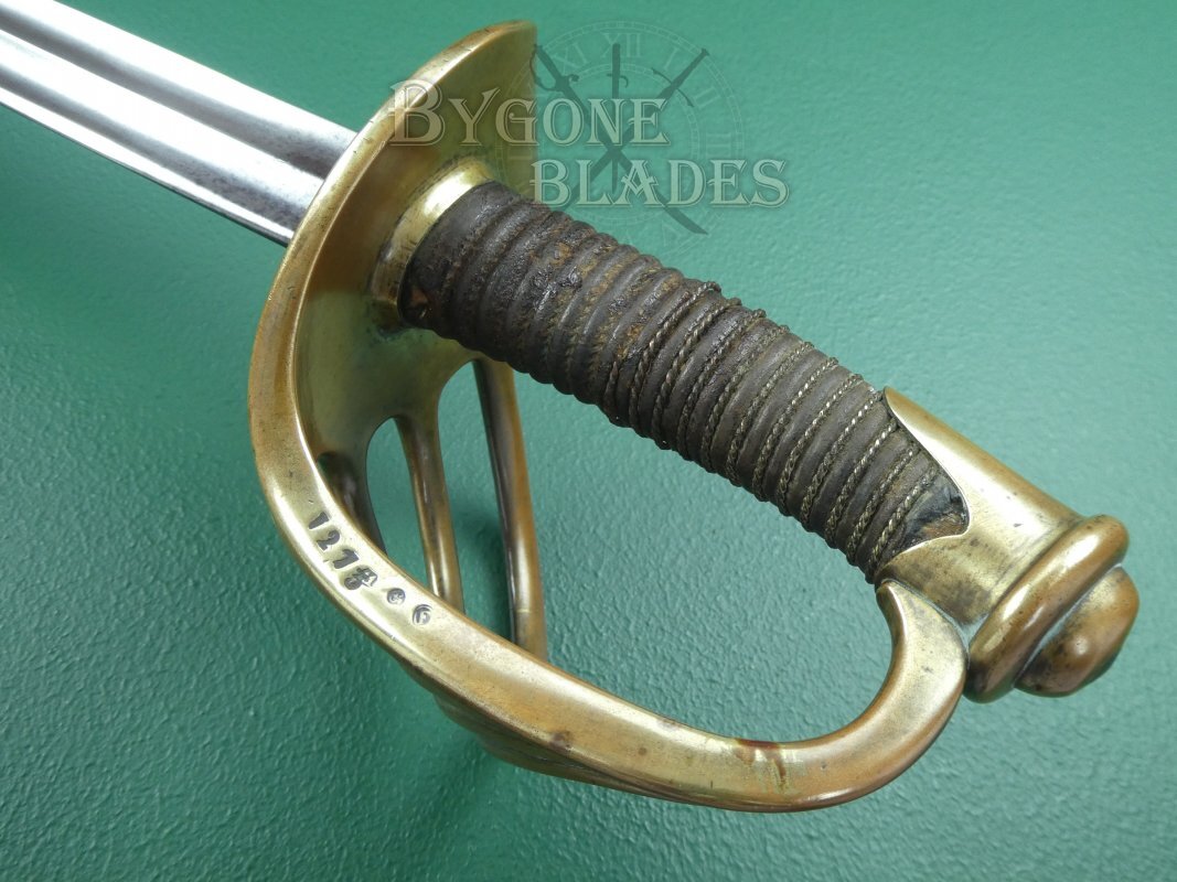 This French Model AN XI Cuirassiers sword has been re-hilted with the 1854 pattern heavy cavalry guard. The AN XI sword blade was made at the Klingenthal armoury in 1814. This was not an uncommon practice as blades in good condition were re-hilted in line with new regulations in hilt patterns and this style of blade was in use by the French heavy cavalry until the late 19th Century.