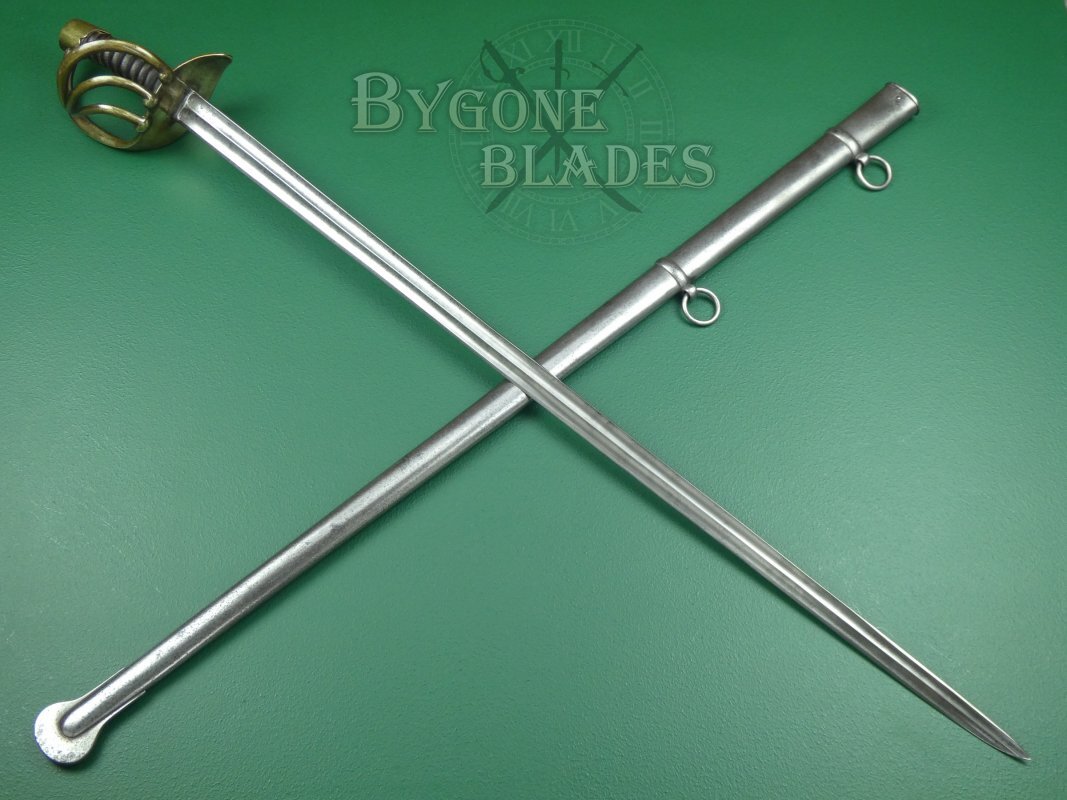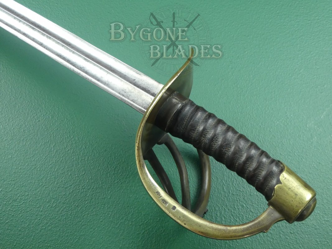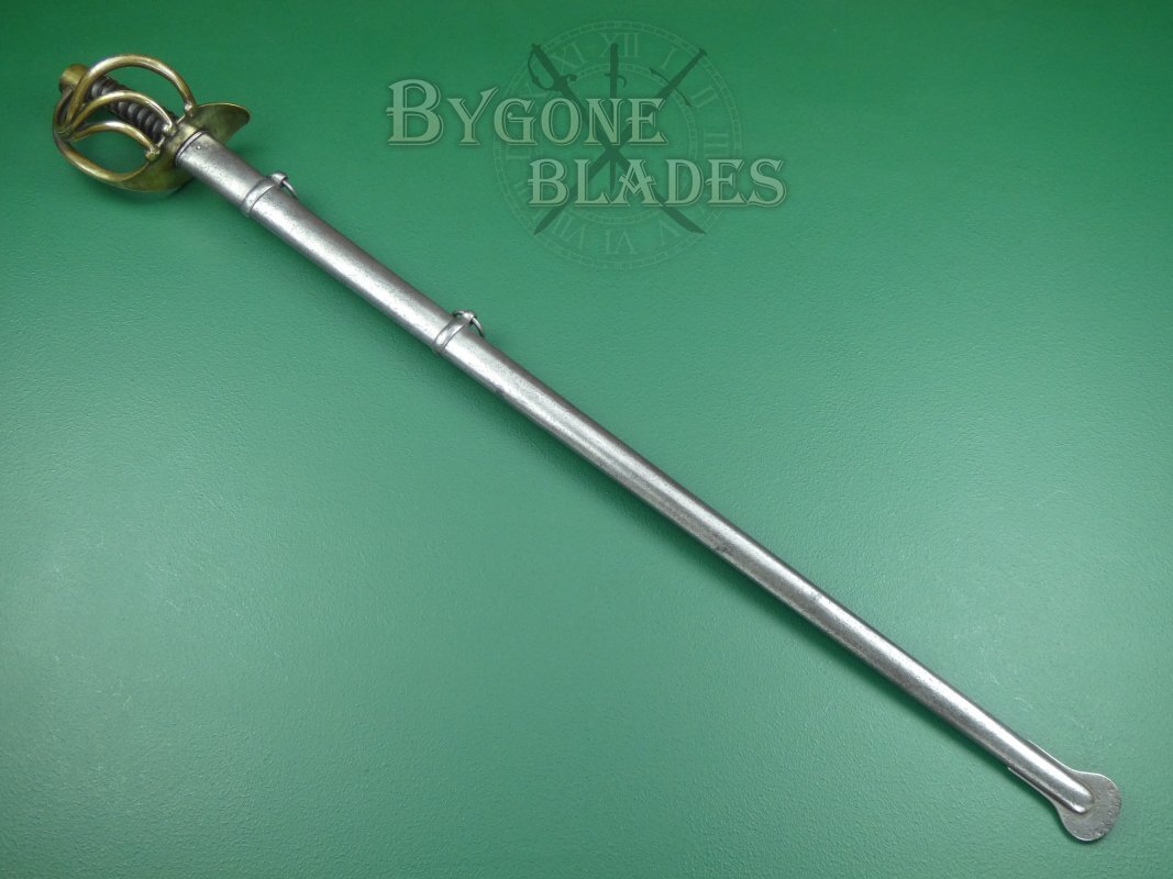 The sword is complete with a third pattern scabbard. These scabbards were officially adopted in 1816 however, examples of these scabbards were recovered from the Waterloo battlefield, indicating that they were in use prior to their official adoption. The first ring band is stamped with the number 922. The scabbard is in very good condition, free from dents or damage and with only mild age related speckling and very shallow pitting towards the bottom.