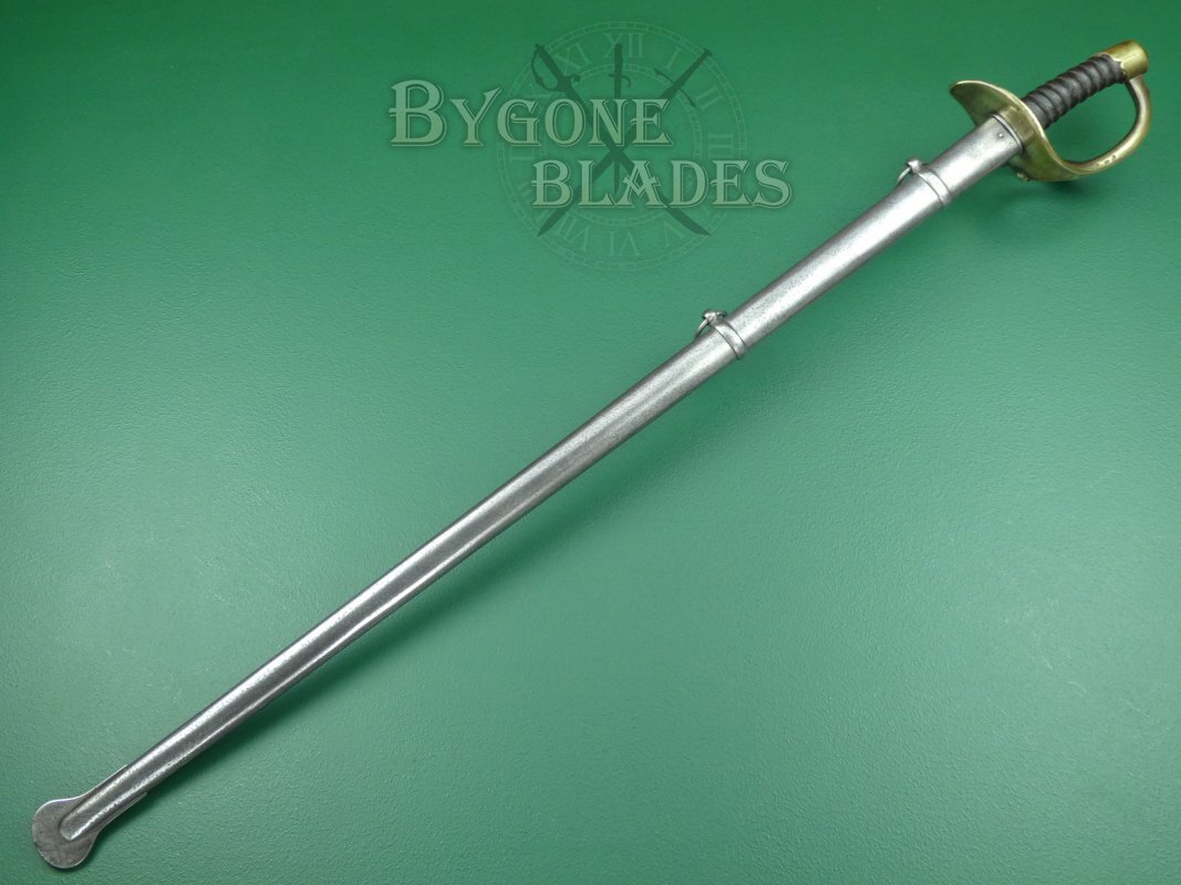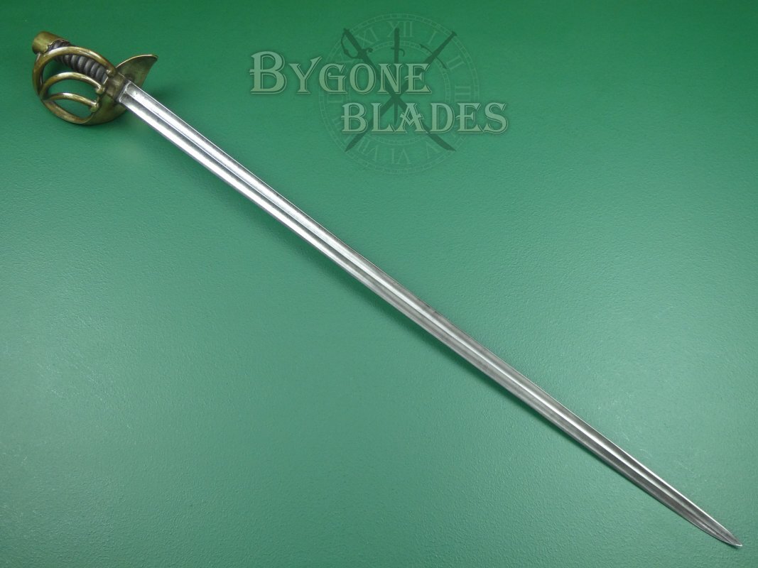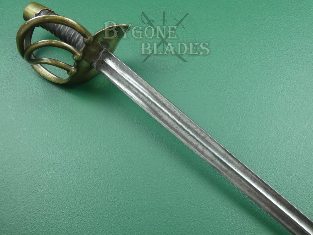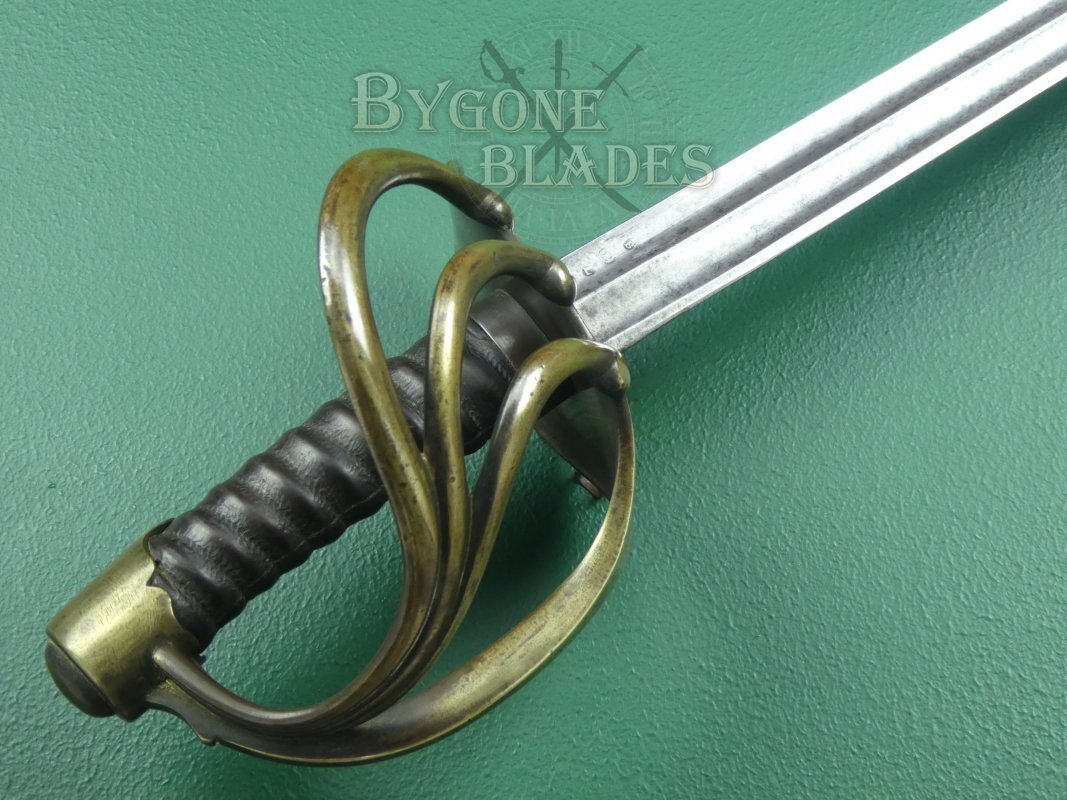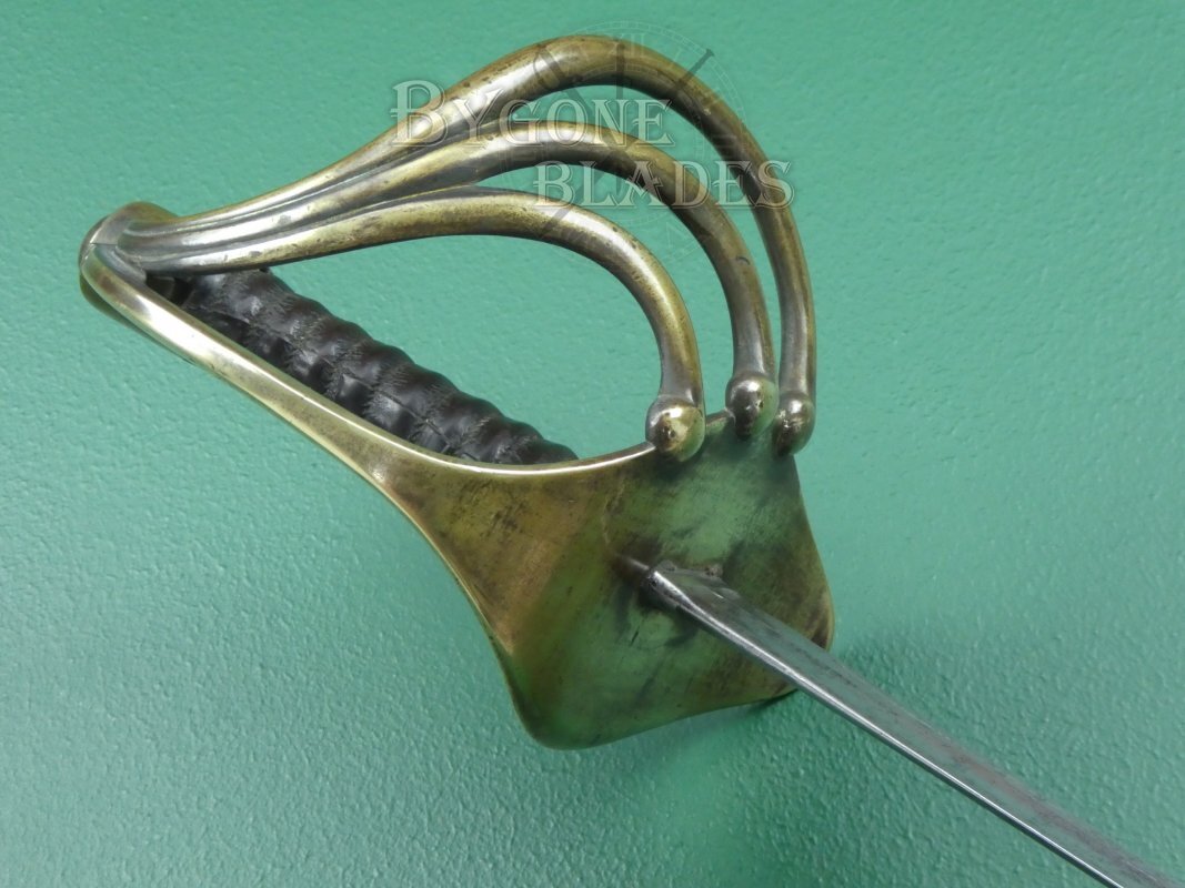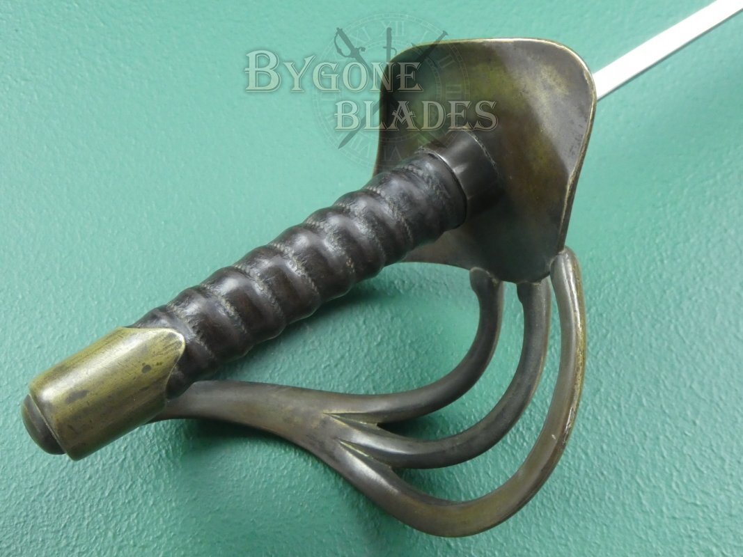 The barred Arco guard is stamped with numerical and lettered inspection marks, including the poincon of Etienne Borson (Klingenthal Director) which is found on the front of the beaked quillon. The leather wrapped grip is in very good condition and retains its original leather. Ten turns of twisted brass wire would have originally finished the grip.
