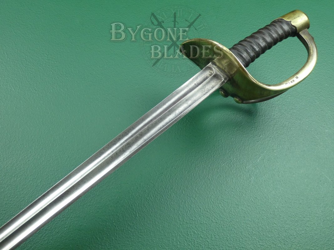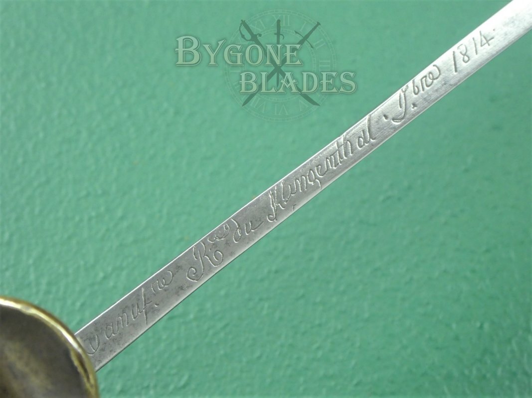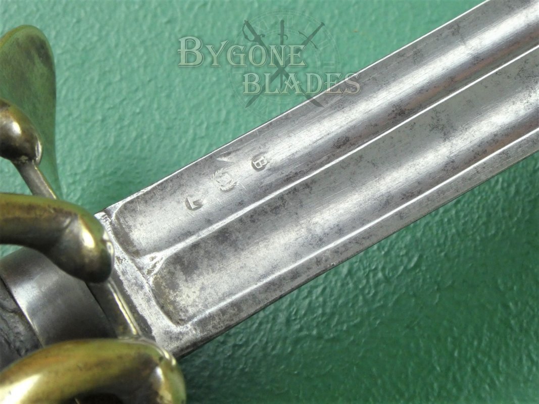 The 954mm straight, single edged blade has a flat spine and twin fullers that continue to the original hatchet point. Around 1815-1816, an executive order required that the hatchet points of these swords be re-ground to spear points. Existing examples with the original hatchet point are scarce. Swords retaining their hatchet point are almost certainly captured weapons and trophies of war. The blade was made at the Klingenthal factory in 1814 and bears the Klingenthal inspection stamps of François Louis Lobstein, Lt. Col. Etienne Borson, and Jean Georges Bick. The spine is clearly engraved with the Klingenthal armoury name and manufacture date.