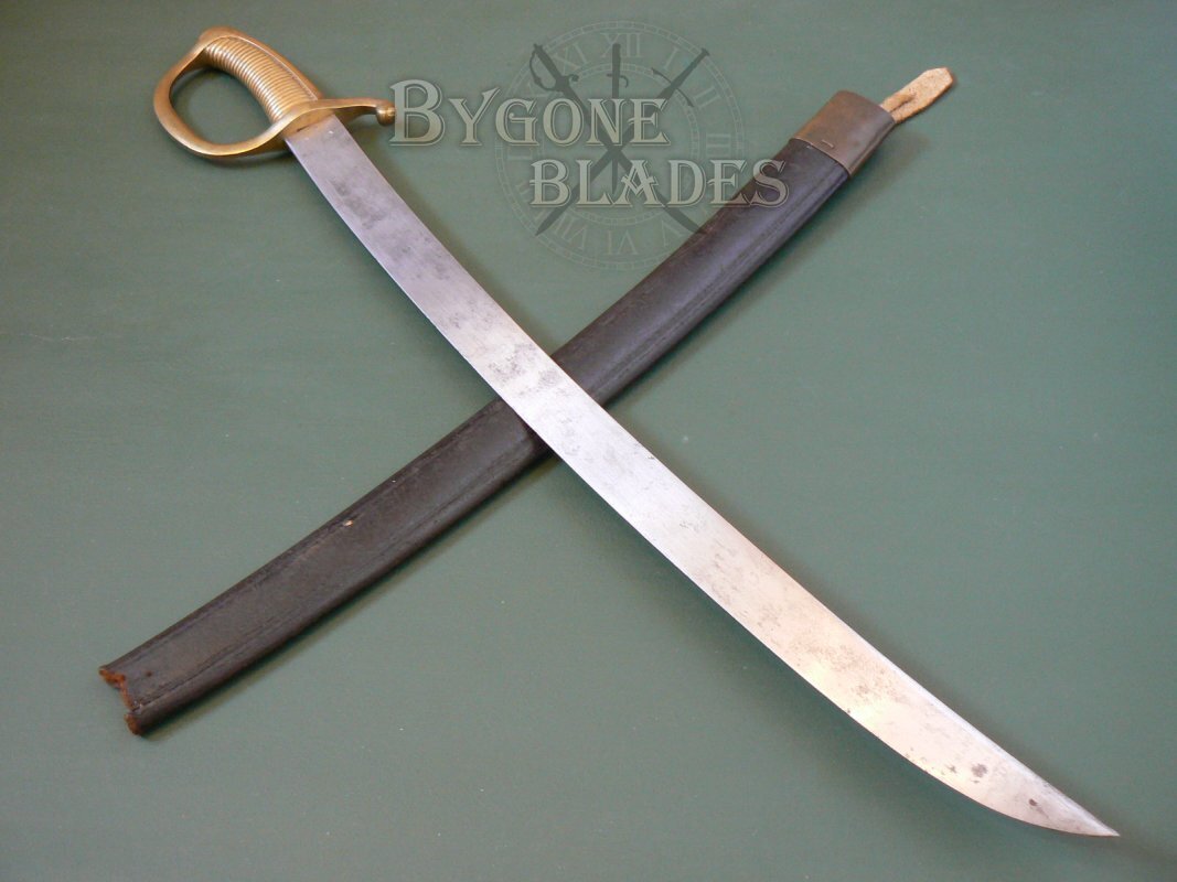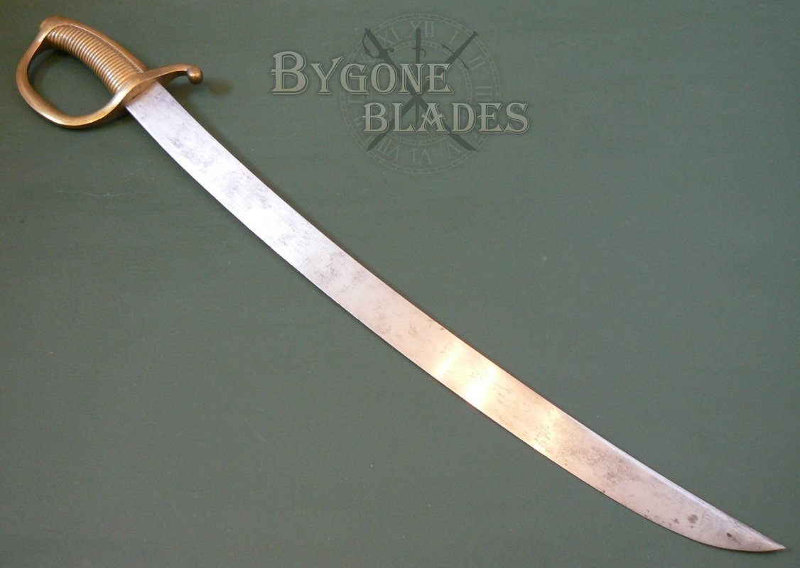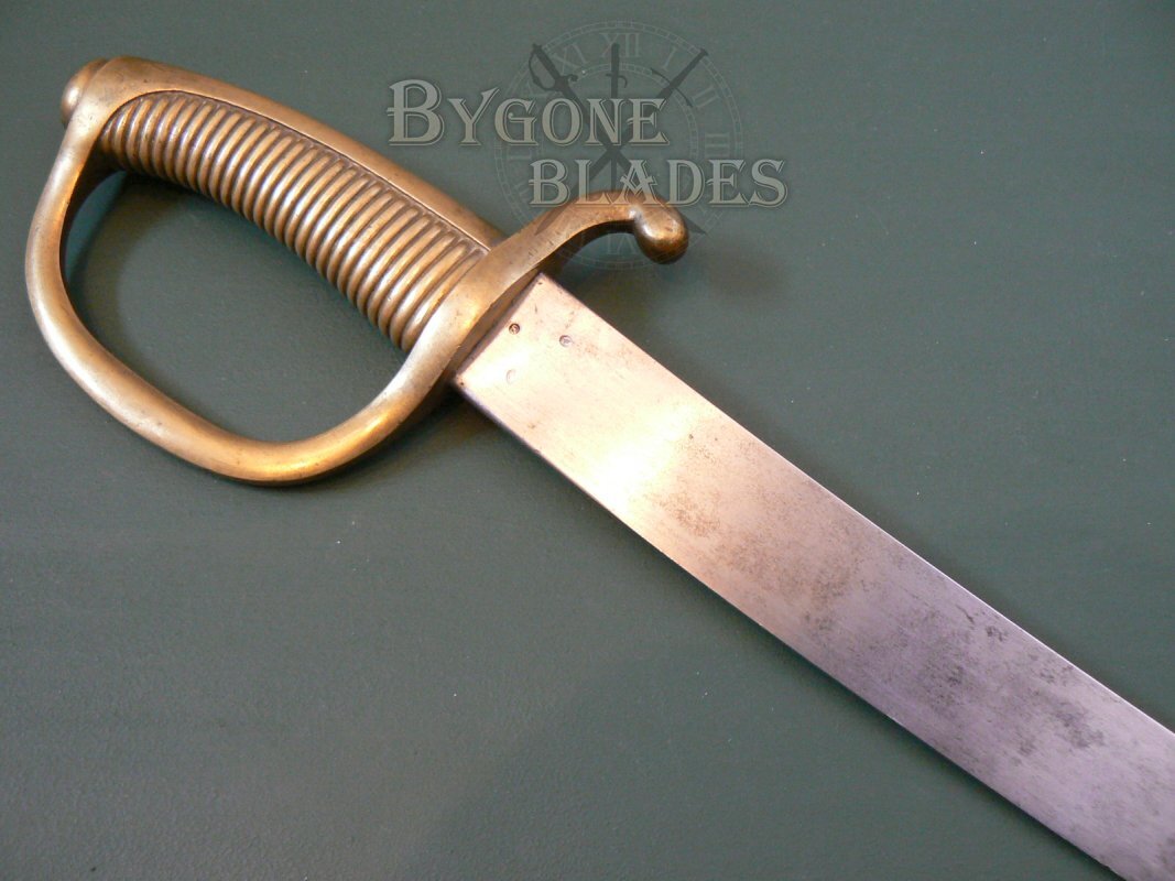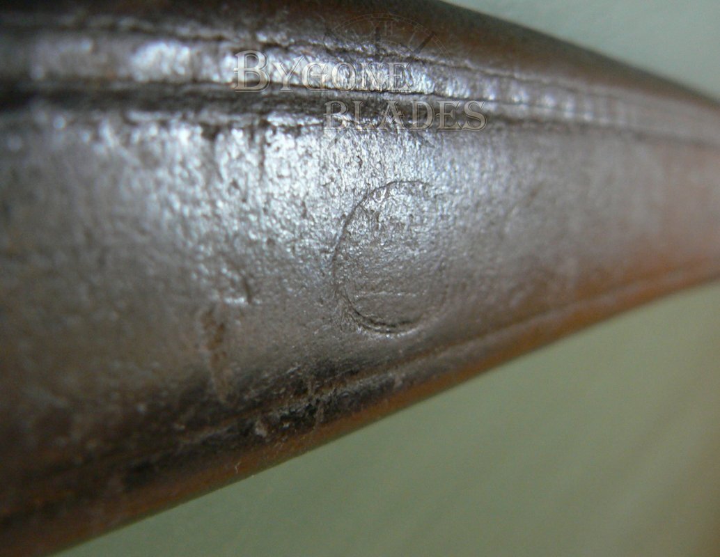 The heavy, 600mm curved blade has a thick, flat spine which is engraved with the armoury and date of manufacture. The hatchet point blade is in very good condition with a nice age patina. The edge has a few combat related nicks.