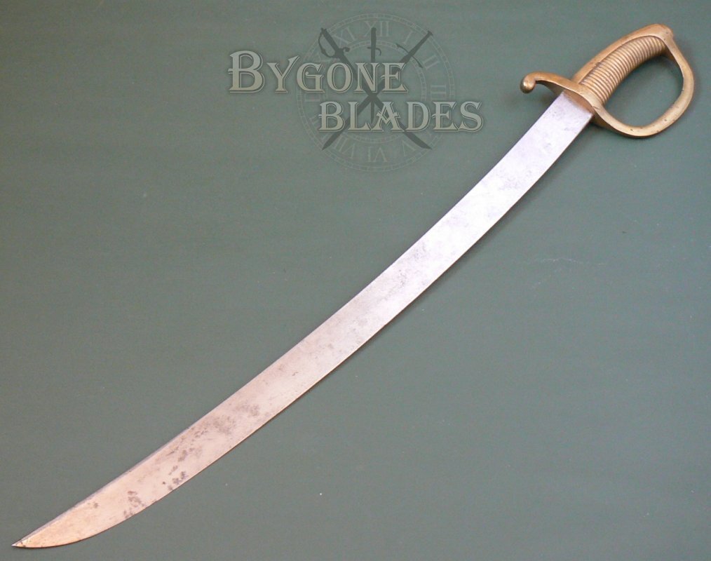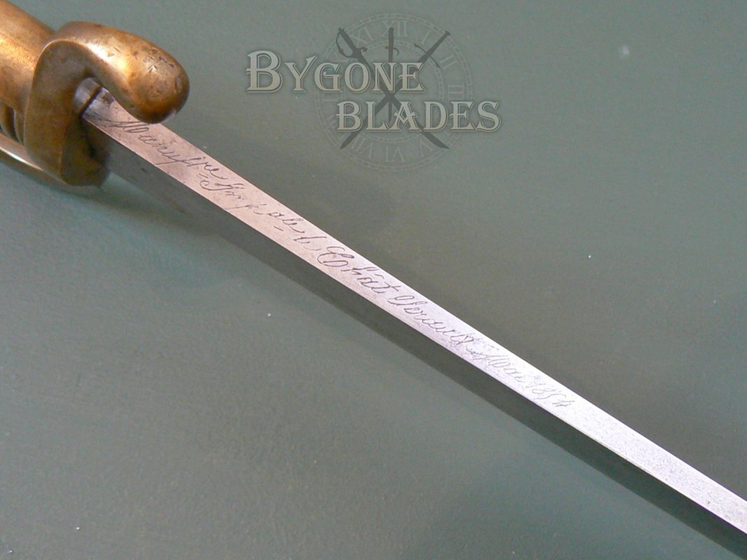 The blade is firm in the ribbed brass hilt. The D-guard bears an inspection poincon.