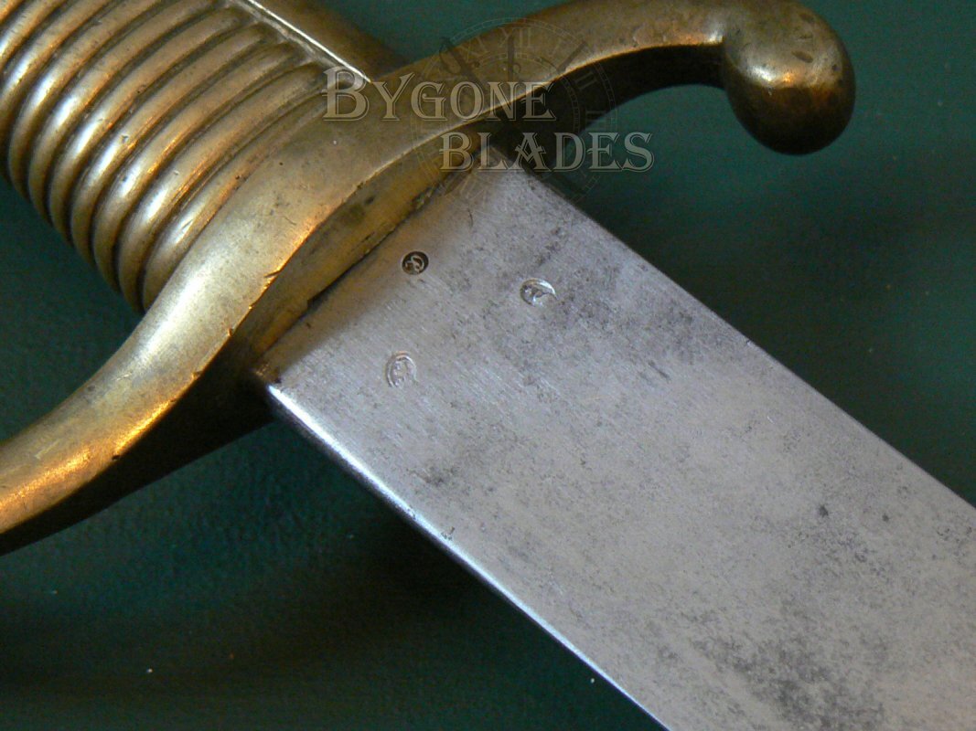 The ricasso bears three French inspection poincon and the obverse bears an additional stamp. The engraved spine dates the briquet to May 1854.
