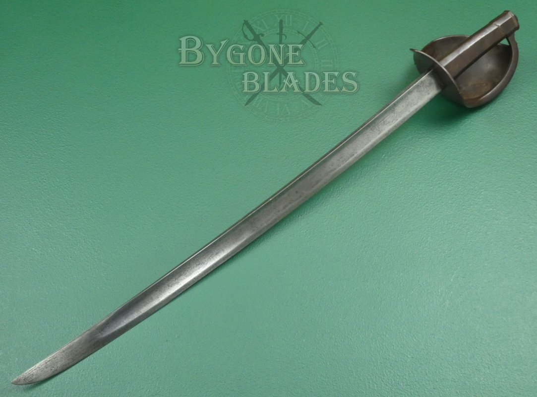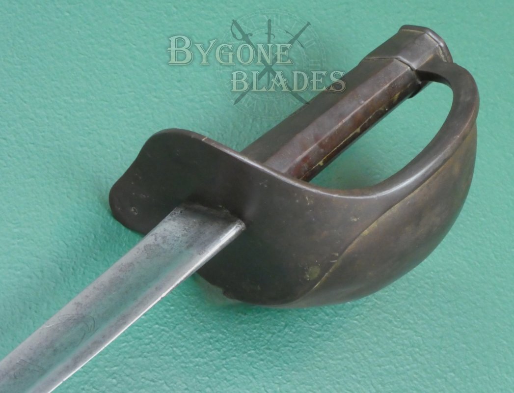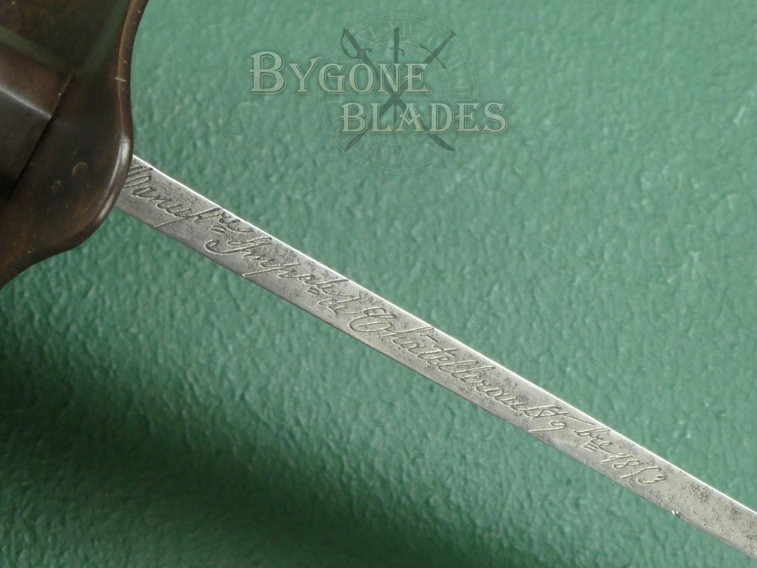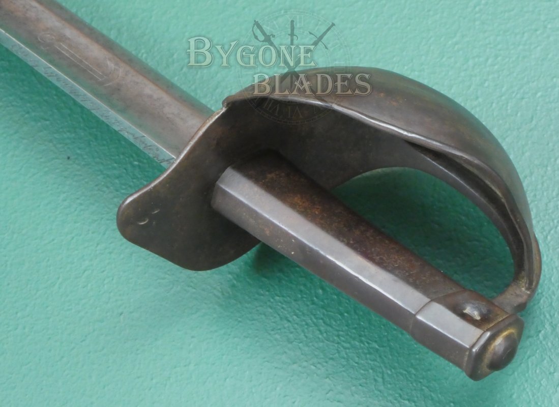 The steel bowl guard is in great condition with marks and small dings consistent with use. The front of the beaked quillon is stamped with two poincon and the rear of the beak has three. The pommel of the faceted iron grip is deeply stamped with the number “1.”