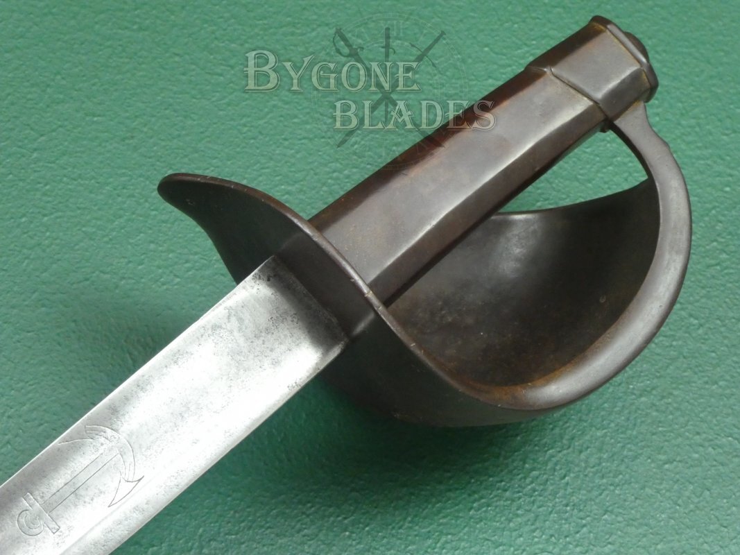The 652mm falchion blade has a thick, flat spine and broad single fuller on both sides. The spine is engraved with the details of the cutlass’ manufacture by the Chatellerault armoury in September 1853. The single-edged blade is double-edged for the last 110mm and terminates in a hatchet point. The blade has been service sharpened and retains its fighting edge.