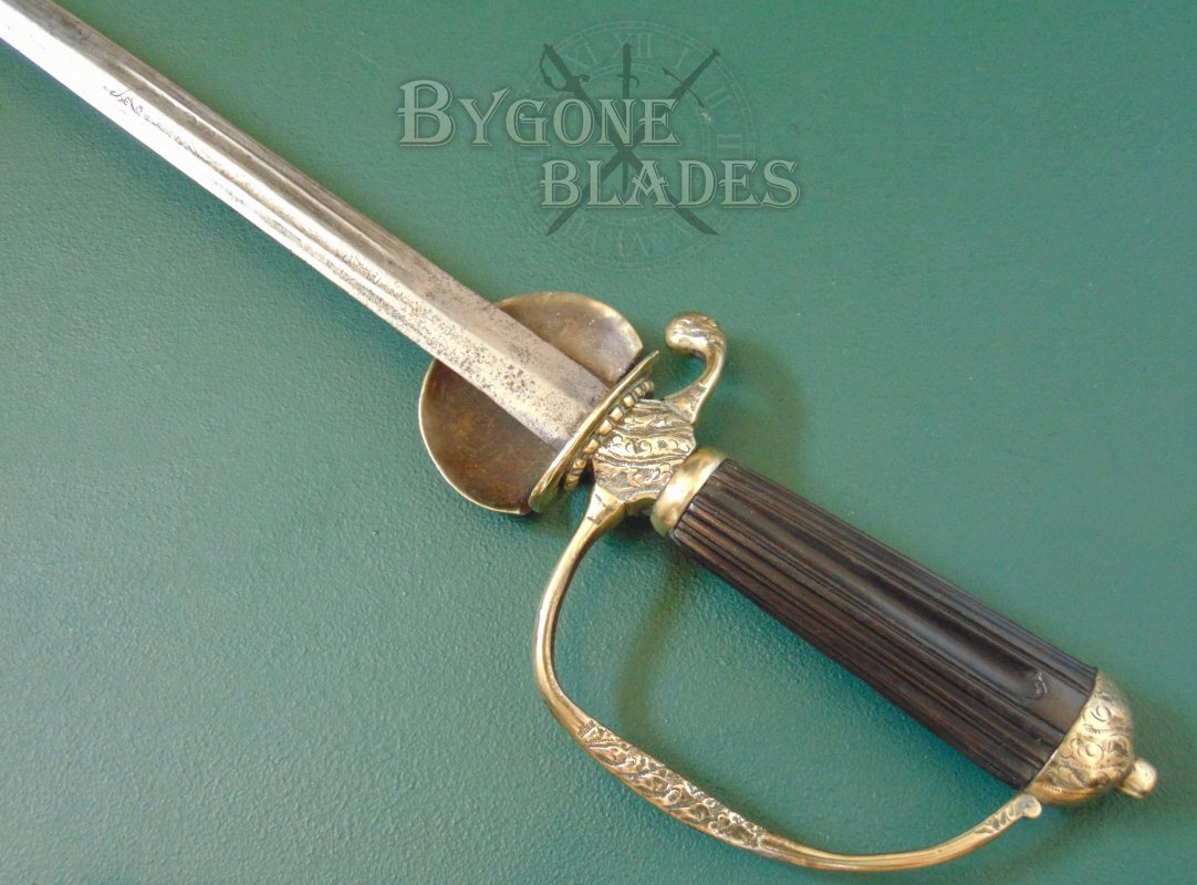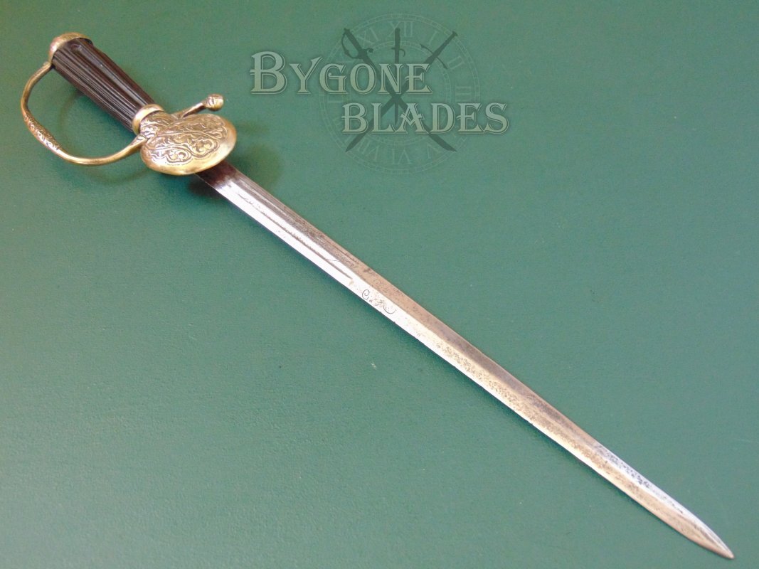 This beautiful little European (probably French) hunting sword dates to the early 1700s. These short bladed swords were originally used for delivering the coup de grace to wounded game when hunting and were known in France as Couteau de Chasse. The versatility and small size of these swords meant that they soon became popular amongst naval and army officers fighting at close quarters. Royal Navy officers and men began referring to these weapons a “Cuttoes,” a nick-name derived from their French name.