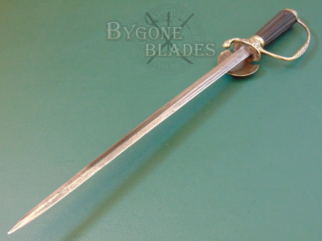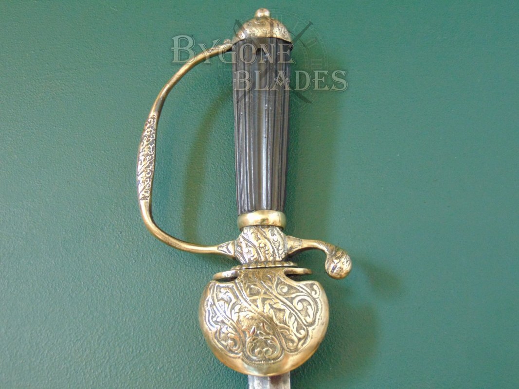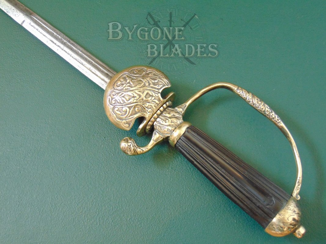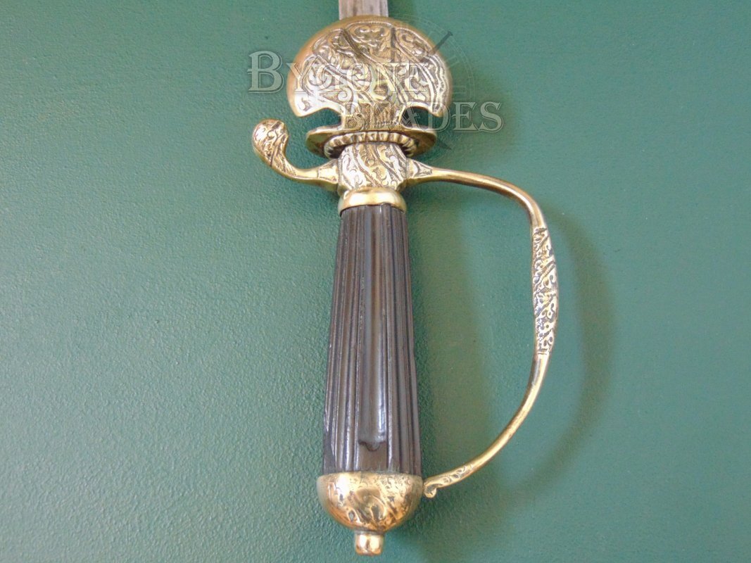 The brass shell guard, knuckle bow, quillon and pommel are decorated with a scrolled floral motif. The brass hilt furniture is in great condition, as is the reeded ebony grip. The blade is firm in the hilt.