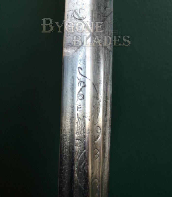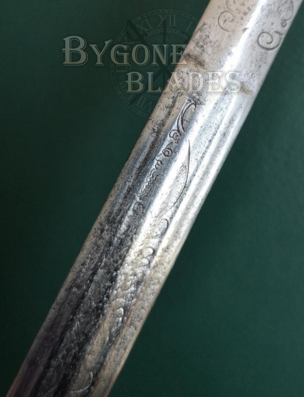 The 344mm double-edged blade has a flattened diamond cross-section with two short fullers on each side. The narrow blade terminates in a spear point and appears to have been re-pointed, perhaps as a result of use and repeated sharpening. The blade is engraved with floral scrollwork with a “Man in the Moon” on each sides. The engraving is worn in places. The blade retains its sharp edges and is in generally good condition with areas of tarnish and shallow pitting.