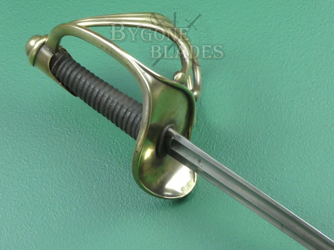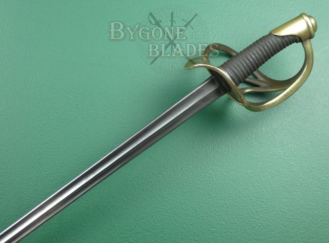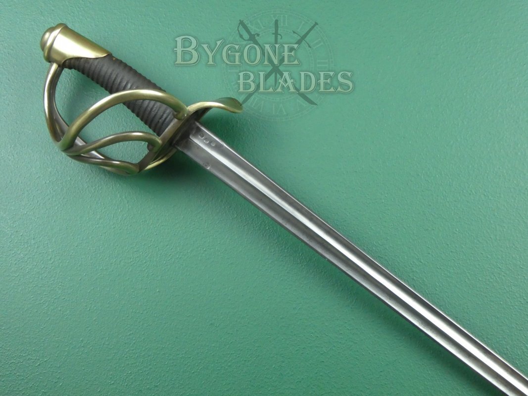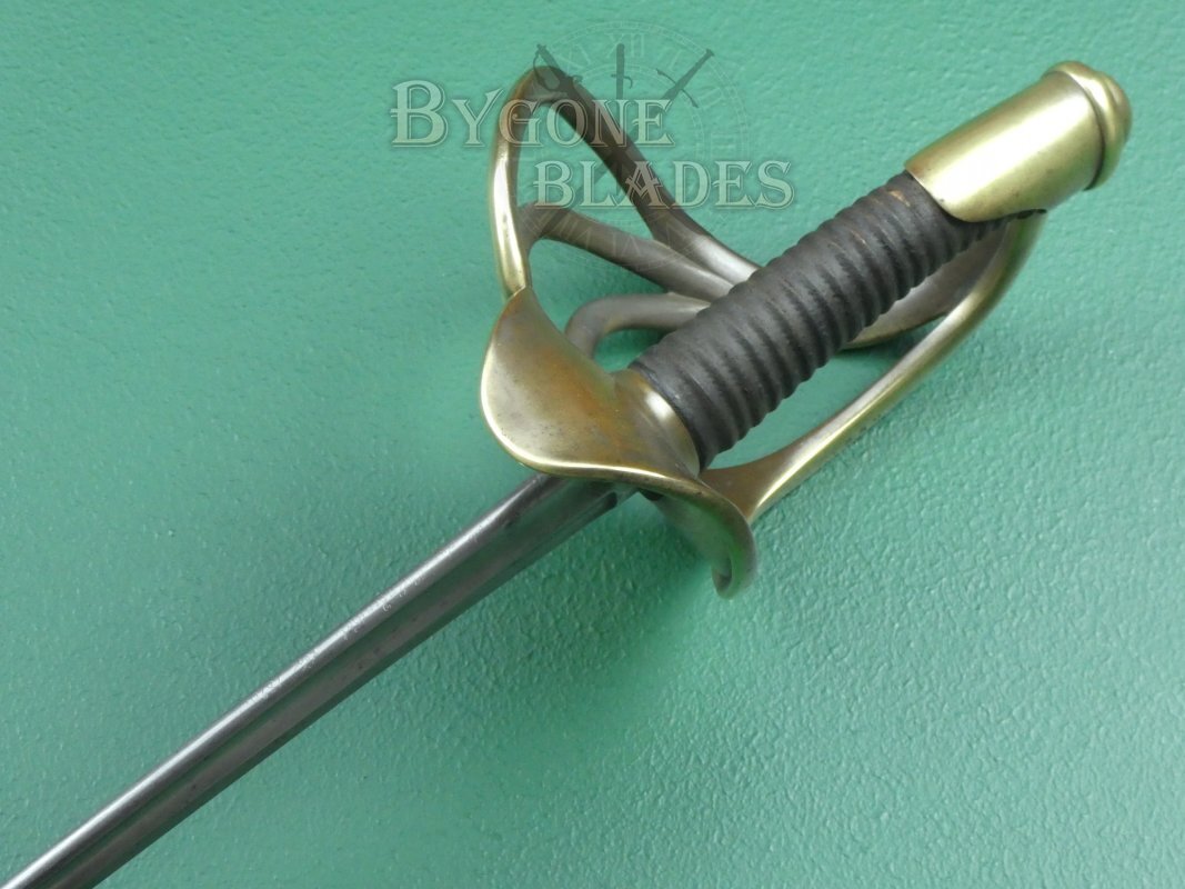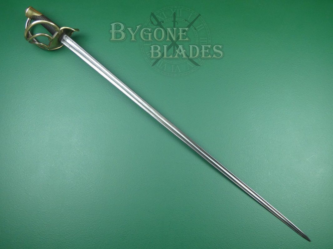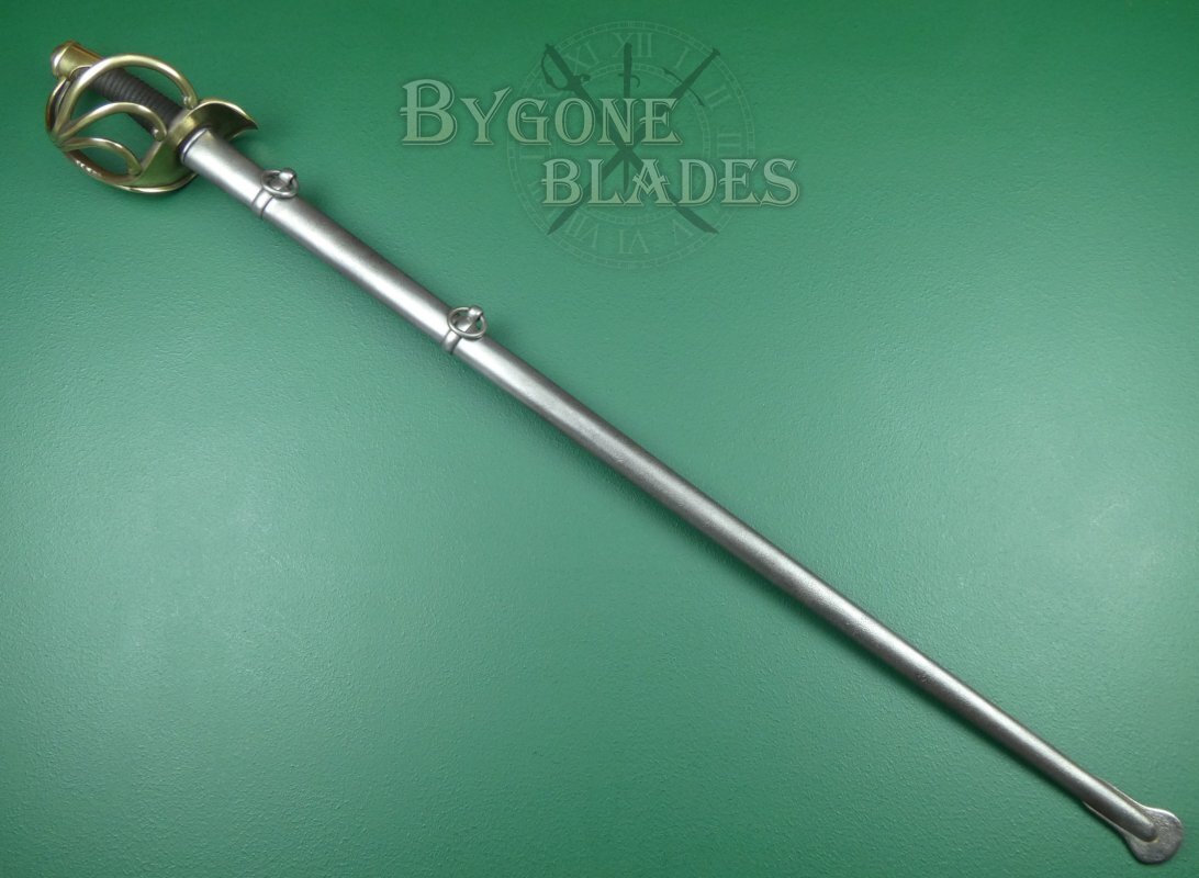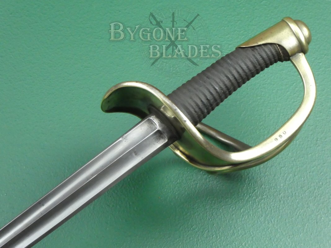 The four barred guard is stamped with the issue/rack number 950 and inspection marks on the knuckle bow and beaked quillon. The leather wrapped grip is in very good condition and retains its original leather without the twisted brass wire.