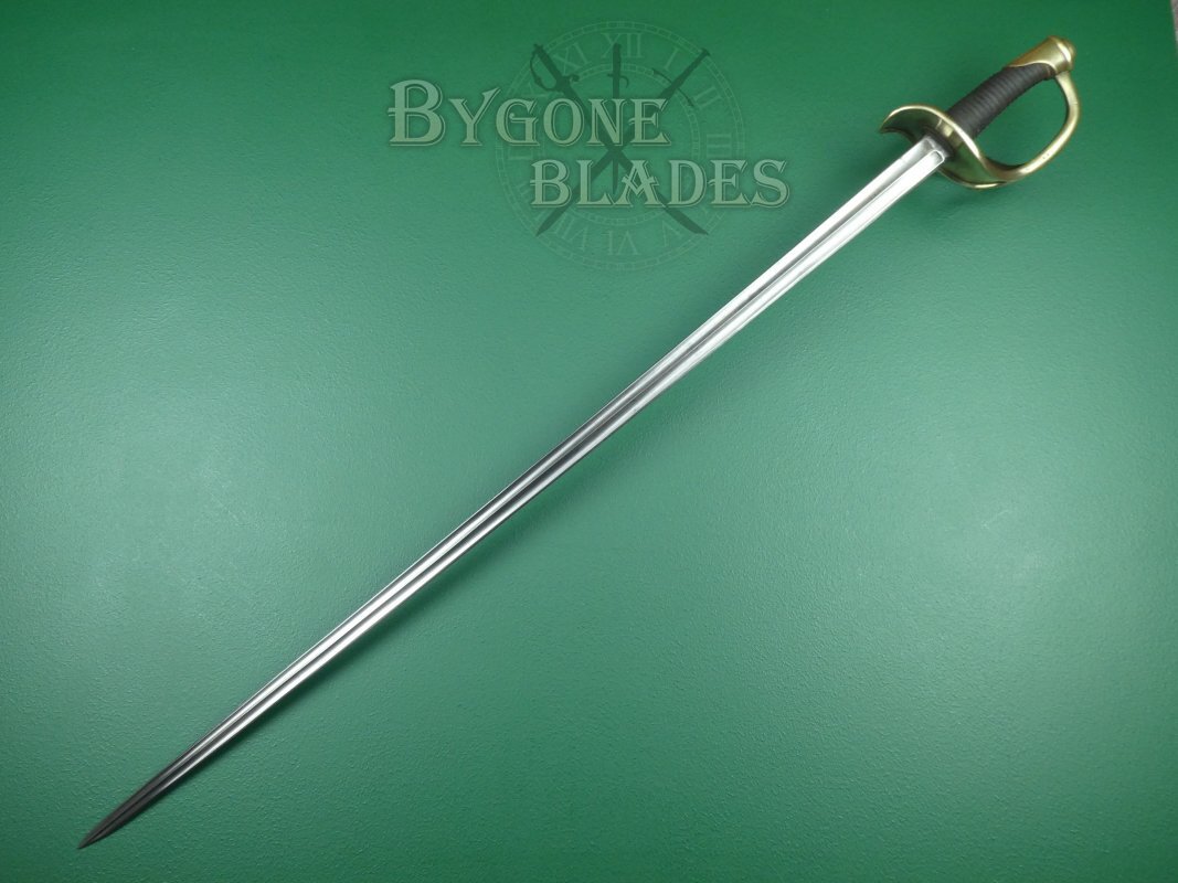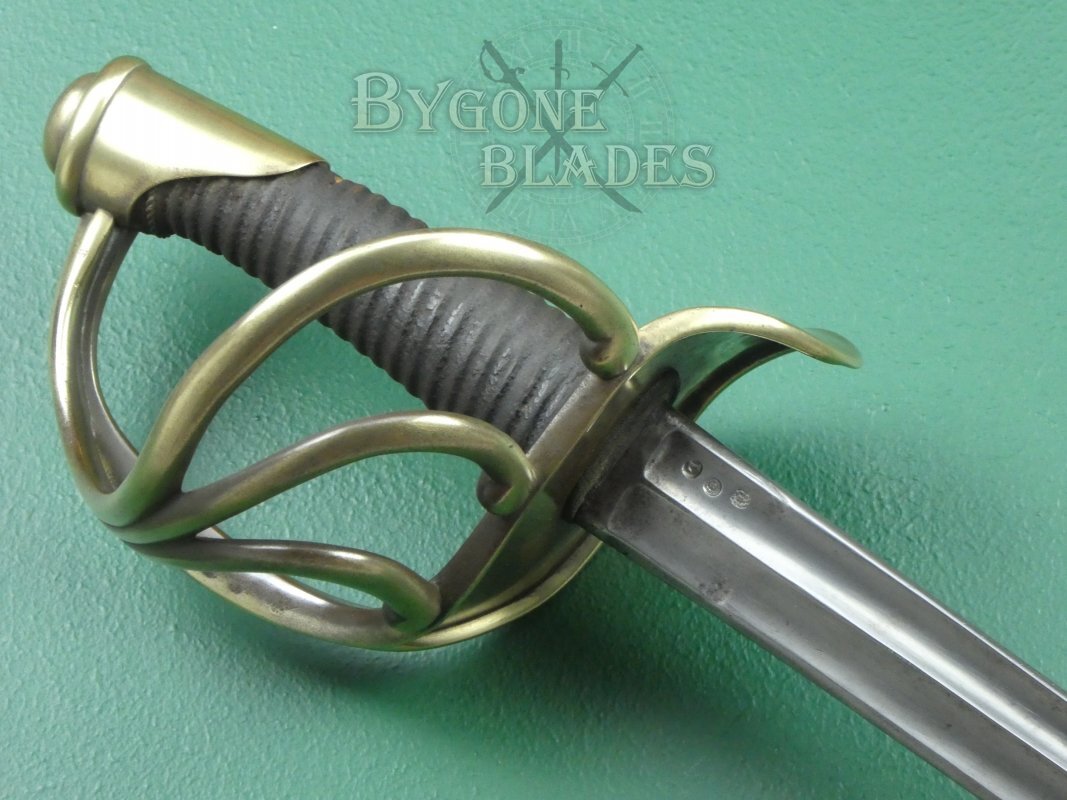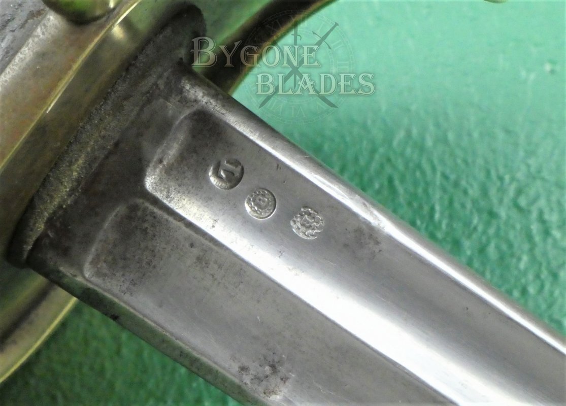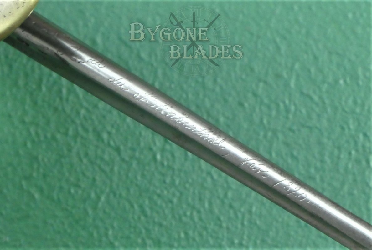 The 998mm straight, single edged blade is of the rare “true” 1816 design, having a rounded spine and twin fullers that continue to the spear point. The blade was made at the Klingenthal factory in February, 1820 and the spine is clearly engraved with these details. The forte of the blade bears the clearly struck poincon of François Louis Lobstein, Jean Joseph Cécile Bureau, and Jean Georges Bick. The blade is in excellent condition.