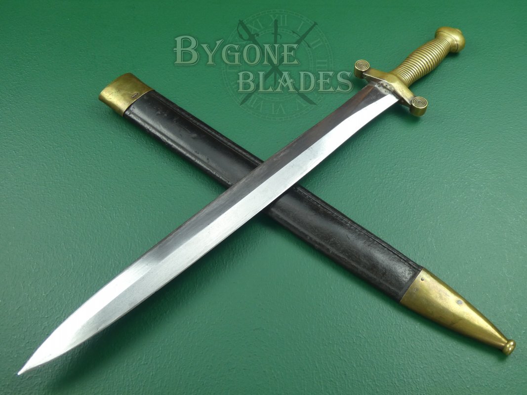 This French Infantry short sword is the Model 1831, “glaive des troupes à pied modèle 1831,” known colloquially by the troops as the “coupe choux” meaning “cabbage chopper.” The Neo-classical design was based on the Roman Gladius.