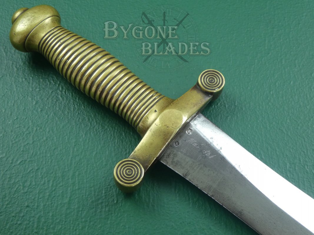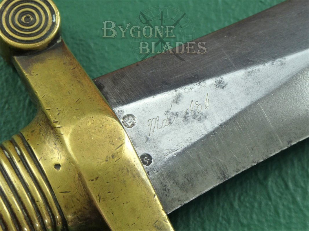 The 486mm double-edged blade has a flattened diamond cross-section and terminates in a spear point. The blade is in excellent condition with some sharpening scratches along the edges. The base of the blade is engraved with the Chatellerault armoury details and the obverse shows the manufacture date of May 1834 above two inspection poincon. The blade is clean and bright with some speckles of tarnish. The blade has been service sharpened and retains its original polish.