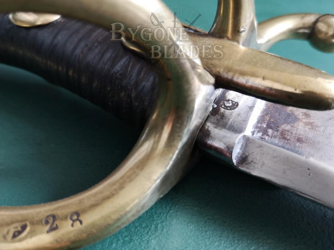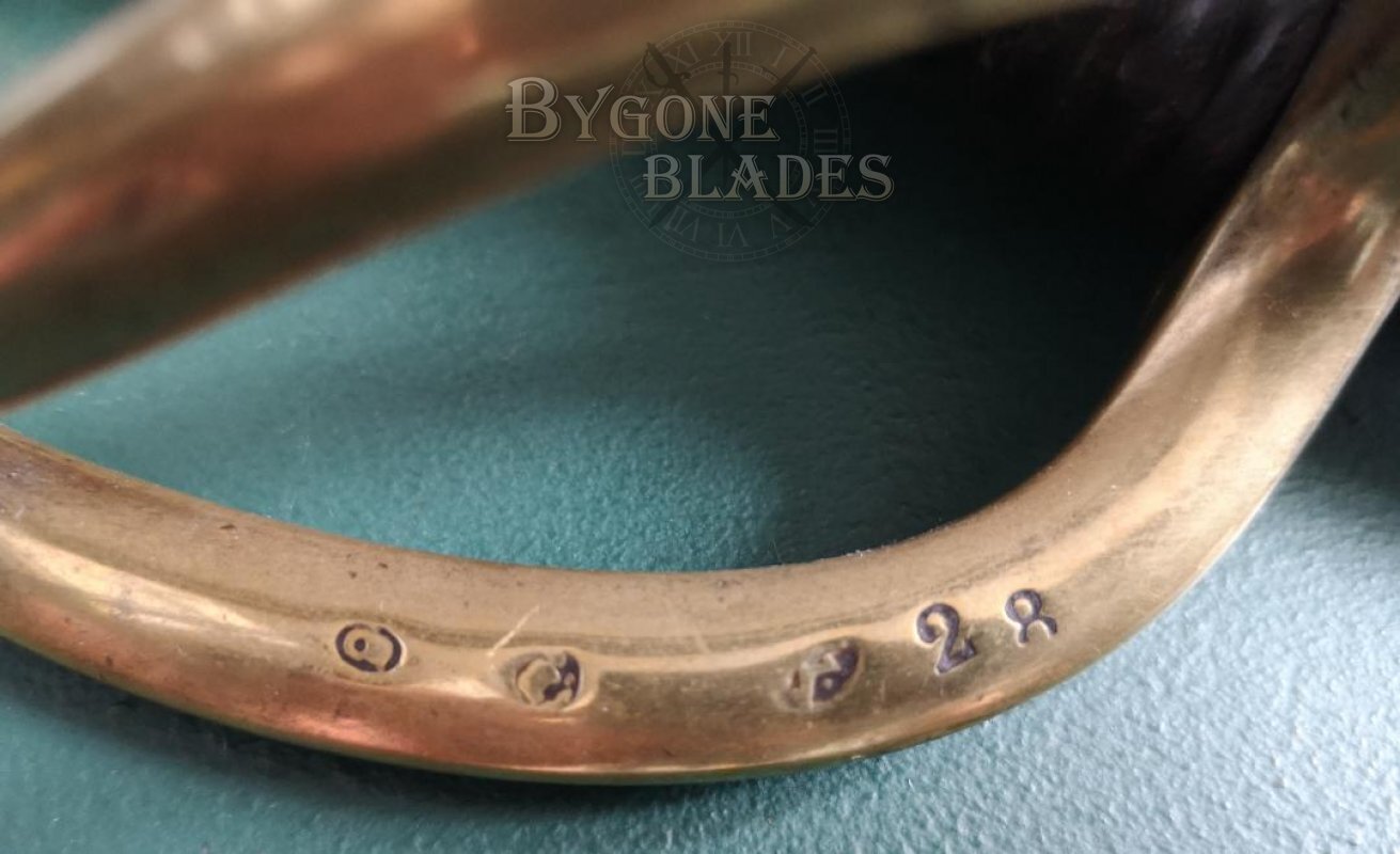 The three bar guard has long, lozenge shaped languets and a leather and cord wrapped wooden hilt with “half olives.” The guard is of gilded bronze alloy called Arco. The left languet is stamped with the rack number 97, which has been over stamped with a zero. The bar of the D-guard is stamped with the number 51 close to where the bar joins the pommel. The oval poincon of Joseph Bisch 1804-1809 is clearly stamped on the inside of the knuckle bow at the front. This poincon has been protected by its position on the guard and so is easy to read. The rest of the poincon on the guard are worn and harder to determine. The opposite side of the knuckle bow is stamped with the poincon (probably) of Claude Marion, Klingenthal inspector from 1808 to 1811 and the number 28. The remaining stamps are hard to determine.
