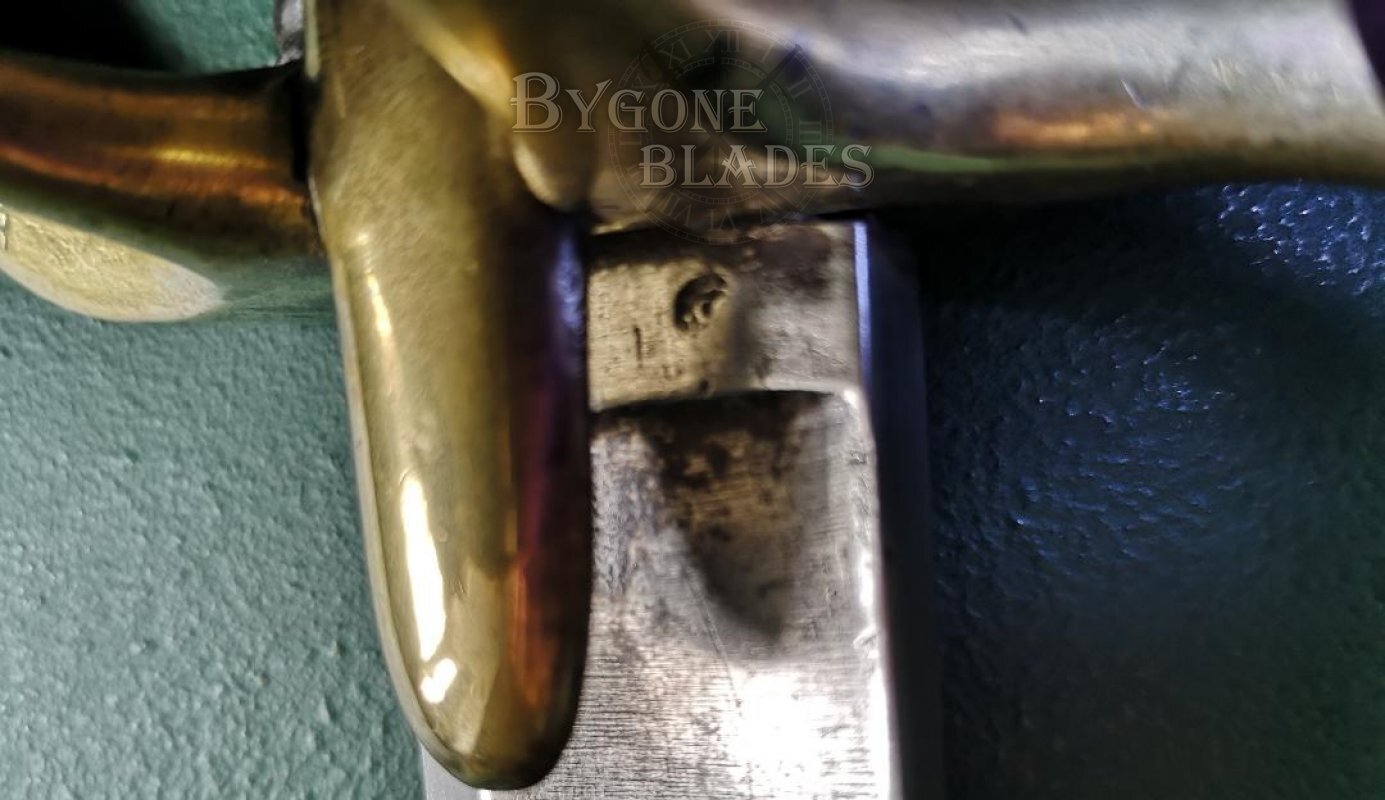 The 876mm curved blade has a broad fuller below a flat spine and ends in a hatchet point. The blade is double-edged for the last 140mm and was period sharpened. The blade is in great condition with very mild speckled tarnish. Repeated cleaning/polishing over the years has almost removed the spine engraving leaving only a trace of the Klingenthal name remaining. The ricasso bears what I believe is the inspection poincon of Francois Ducret, a Coulaux inspector from 1805 and a second, worn stamp. The stamps are partially concealed by the languet.