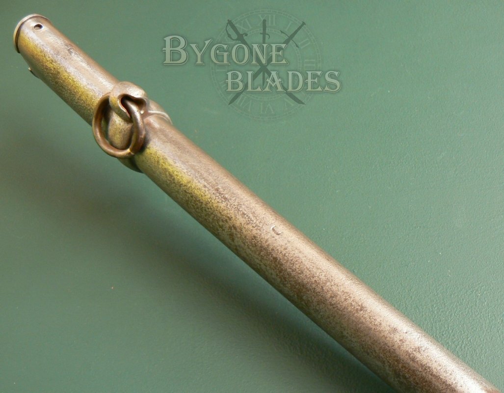 The sabre is complete with its original heavy steel AN XI pattern scabbard. The AN XI scabbard has slightly rounded suspension ring bands and is made of much thicker steel than the earlier AN IX model scabbard. The wear to the eyes of the suspension bands indicates that this sabre was in service for quite some time. The scabbard is in good condition, with some shallow pitting and a mild age patina. There are some small corrosion perforations on the bottom at the junction with the shoe. The second suspension ring looks to be a historic replacement and the throat is missing its single screw. The sword sheathes and draws smoothly and is held firmly within the scabbard. The first suspension band bears the number 19, and the letter “C” is stamped on the inside edge between the suspension bands.