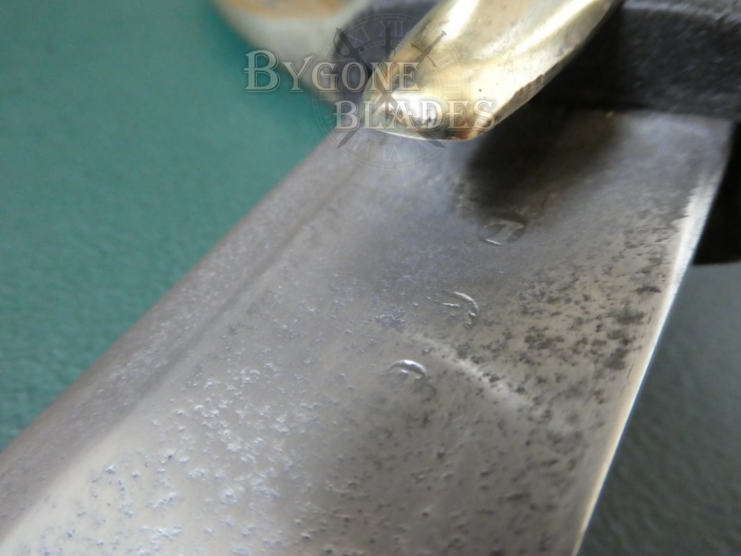 The 876mm curved blade has a broad fuller below a flat spine and ends in a hatchet point. The blade is double-edged for the last 140mm and was period sharpened. The blade is in generally good condition with shallow pitting at the point and along the edge and below the spine. The pitting is very shallow and can barely be felt when running a finger along the pitted areas.