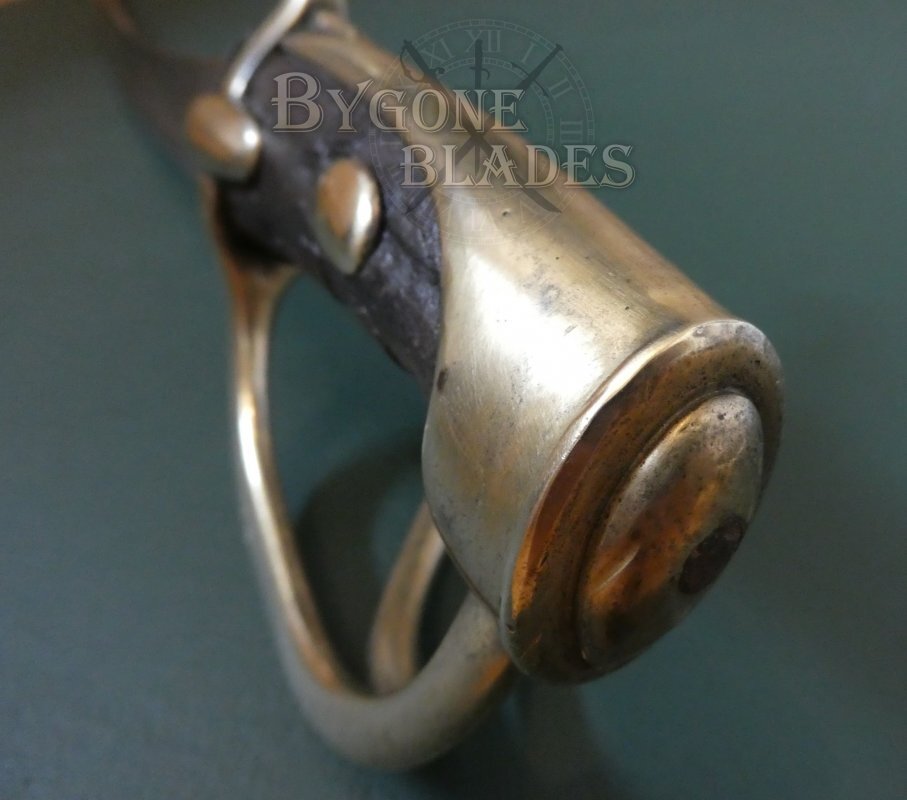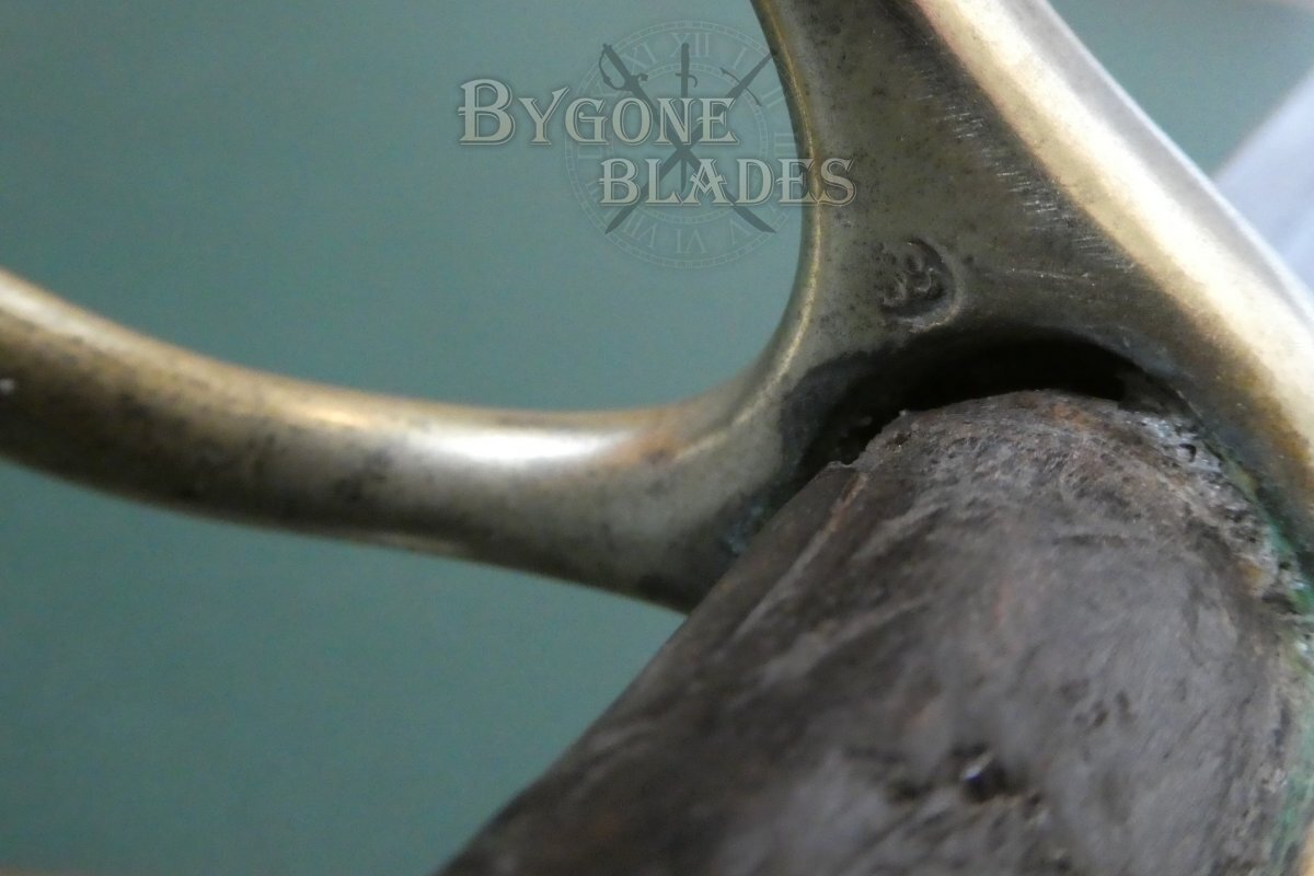 The three bar guard has long, lozenge shaped languets and a wooden grip with “half olives.” The grip has lost most of its leather wrap but remains solid and strong. The guard is of gilded bronze alloy called Arco. The bar of the D-guard is stamped with the number 59 and the oval poincon of Joseph Bisch is stamped on the inside of the knuckle bow at the front. Slight indentations indicate that additional stamps were present on the side of the knuckle bow but these have been polished out over time. The blade is firm in the hilt.