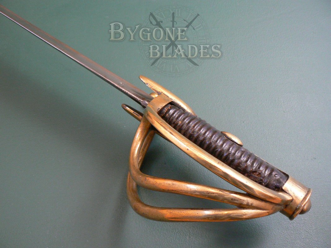 The sabre is complete with its original heavy steel scabbard. The scabbard is in excellent condition. The sword sheathes and draws smoothly and is held firmly within the scabbard. The scabbard has a good age patina with patches of darker tarnish. The throat of the scabbard is marked with the number 28 over the letter E. The mouth is marked with XI and the first suspension band bears the number 55.