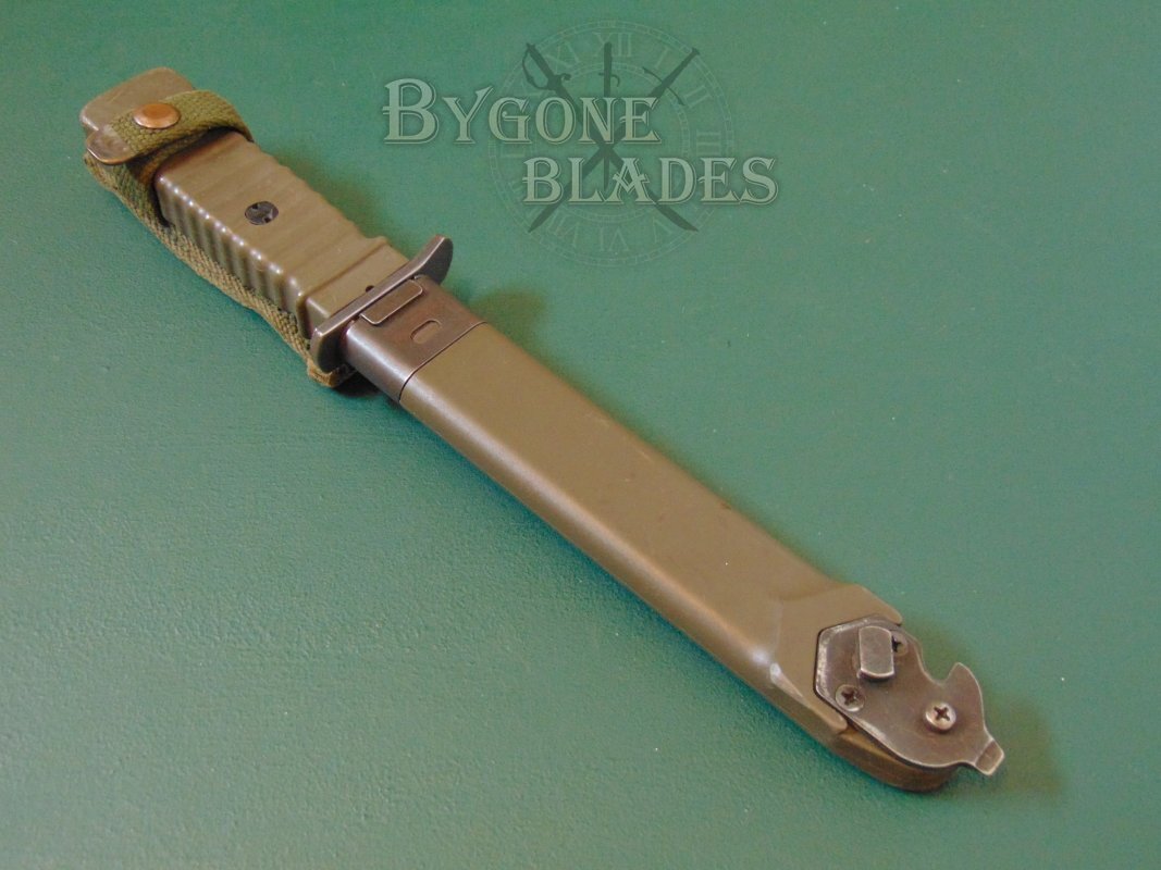 The knife is complete with its scabbard with wire cutting attachment. The plate attached to the end of the scabbard also incorporates a screwdriver and a bottle opener. The knife sheathes and draws smoothly and is held firmly within the scabbard.