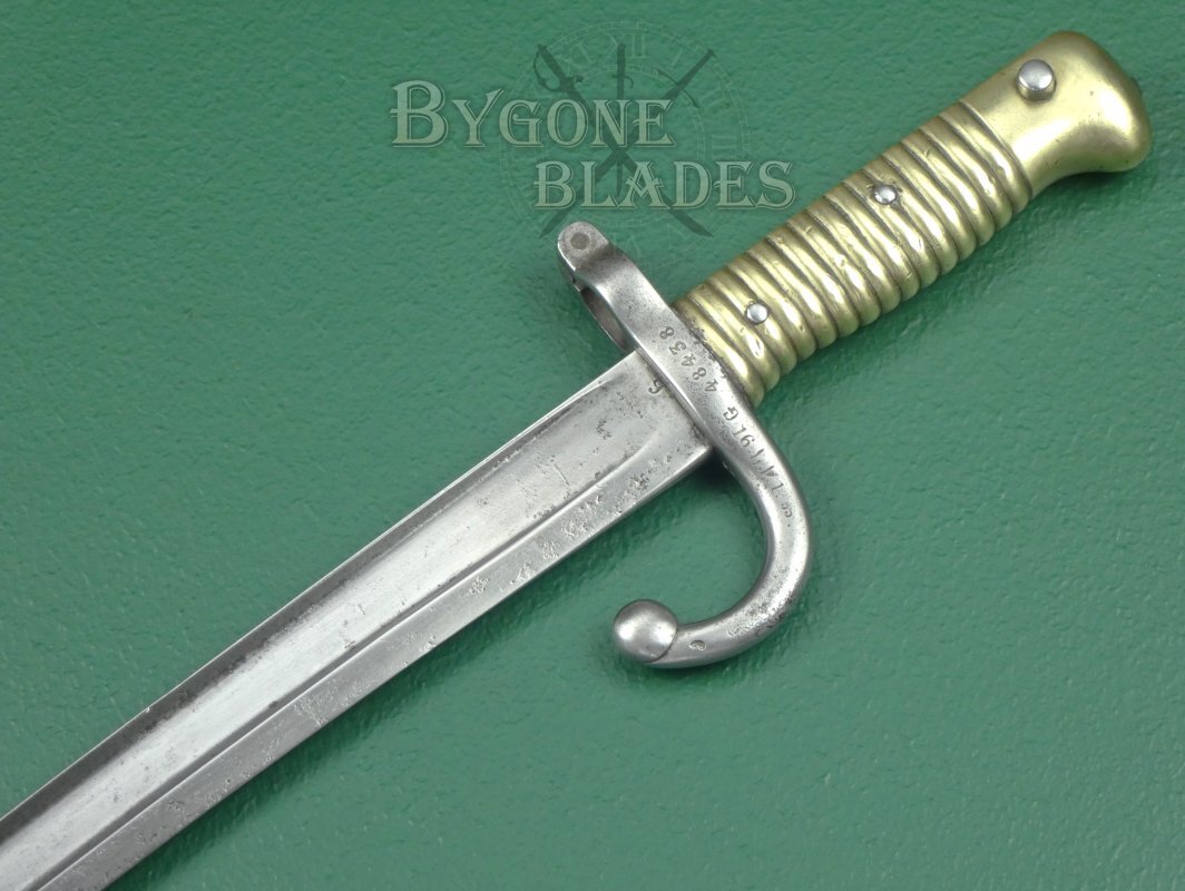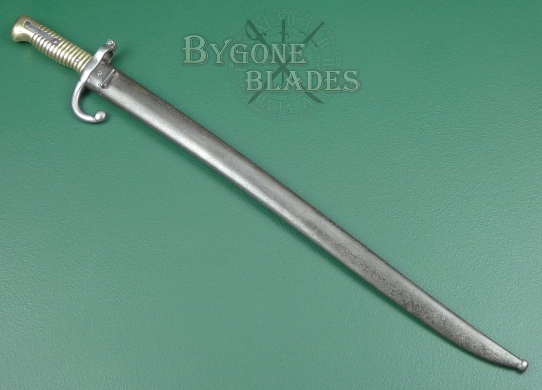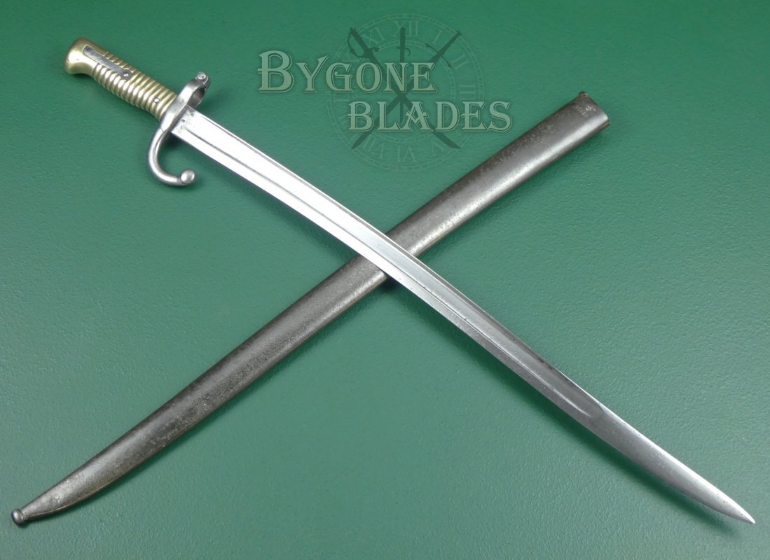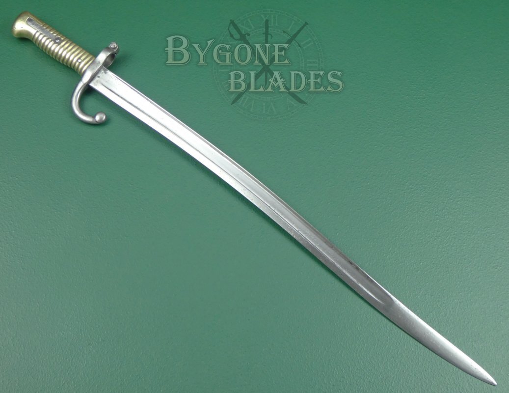 Prussian issued French model 1866 yataghan sword bayonet for the Chassepot rifled musket. After winning the Franco-Prussian War of 1870-1871, the Prussians seized French weaponry as spoils of war. Amongst these seizures were Chassepot bayonets. This bayonet was made at the St. Etienne armoury in April 1868.