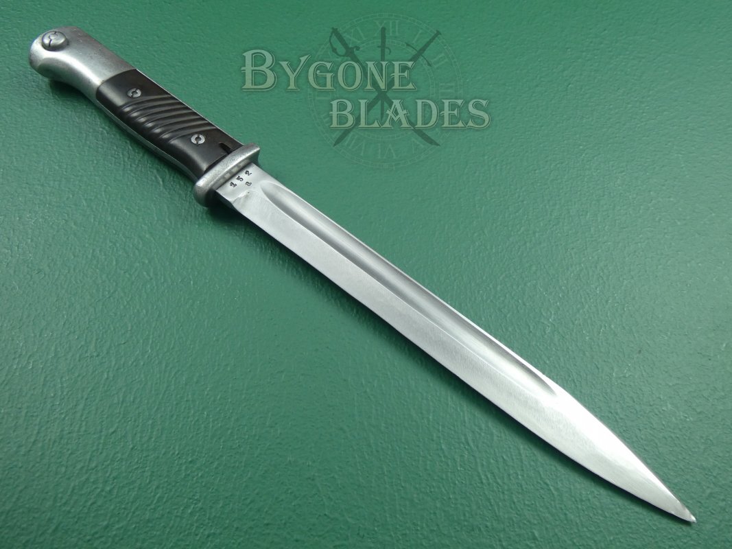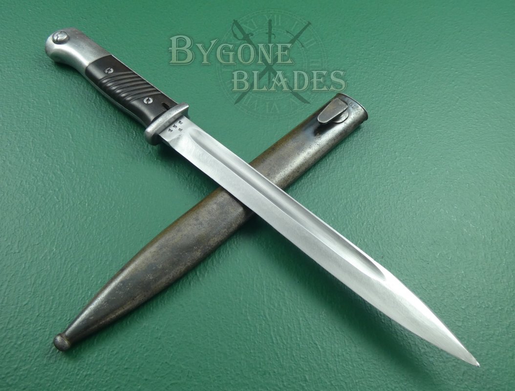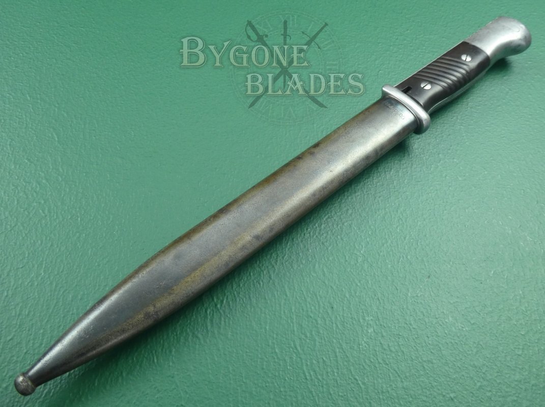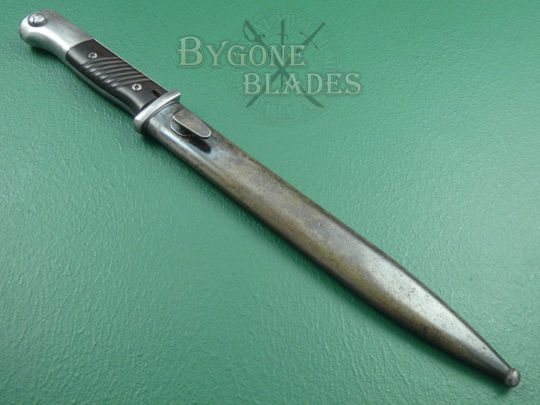 This is a good, example of the famous German WW2 bayonet with matching numbered scabbard.
