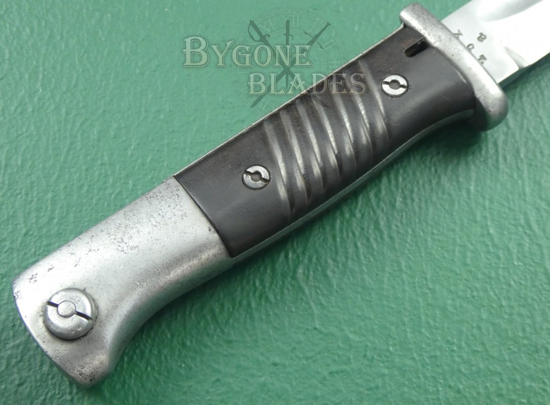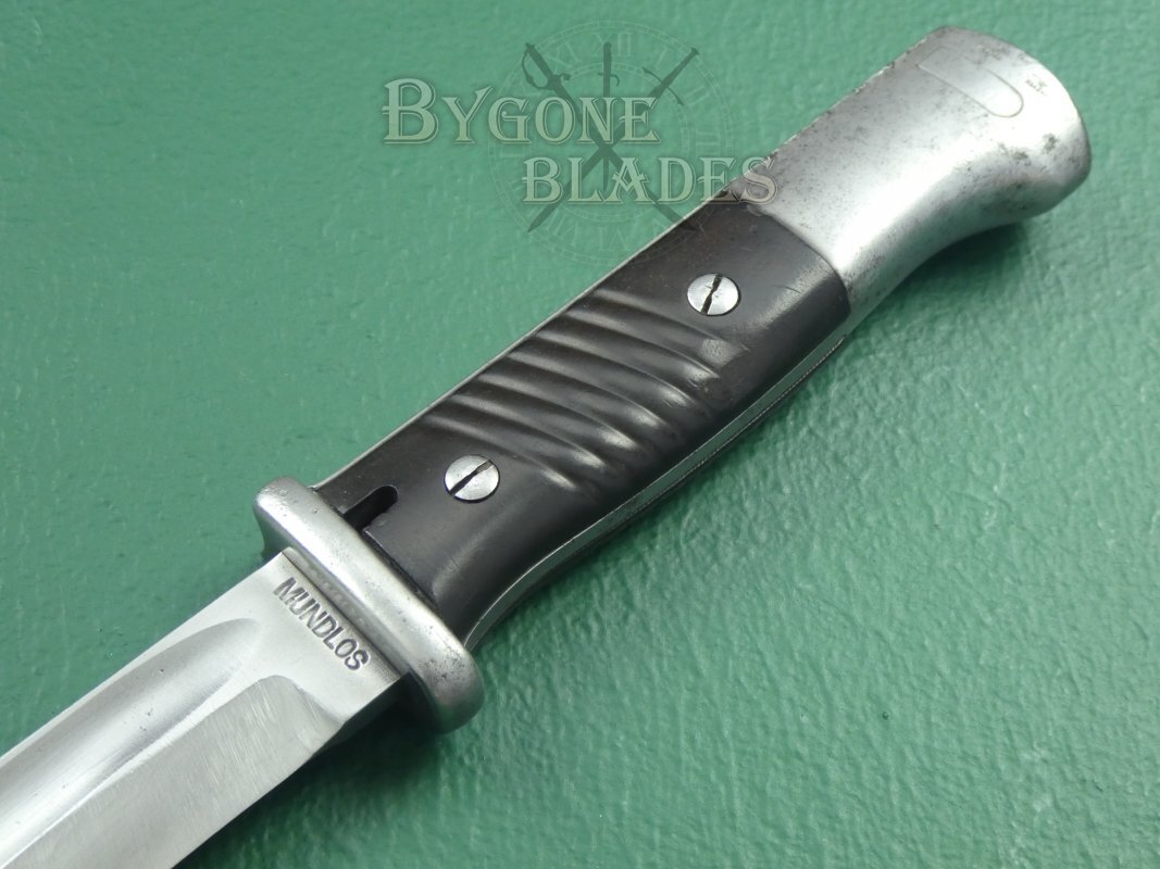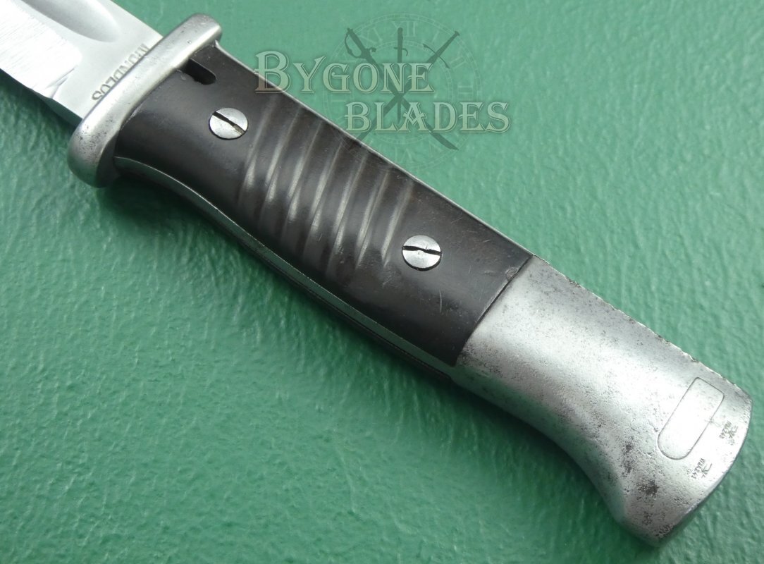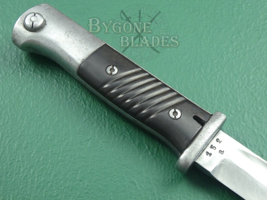 This is a good, example of the famous German WW2 bayonet with matching numbered scabbard.