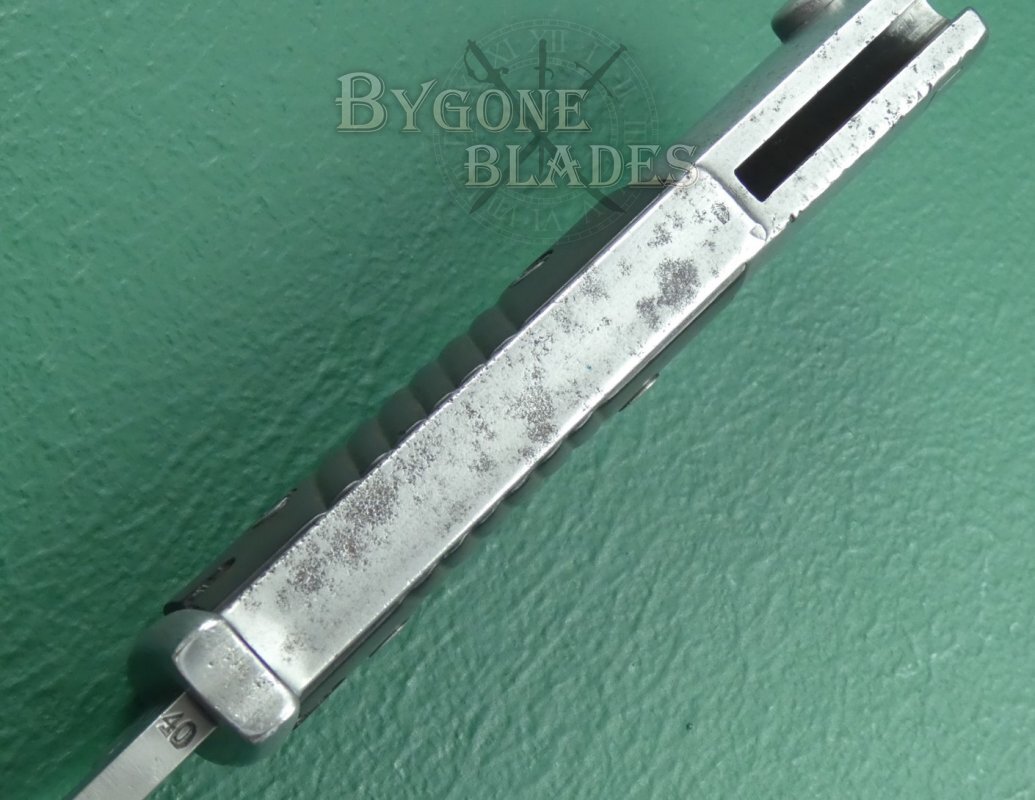 The 248mm single edged blade has a deep single fuller on both sides and is in good condition. There are sharpening scratches along its length and the blade is very sharp. The blade is stamped on the spine with the date mark “40” for 1940. The ricasso is marked with the maker’s trademark, Mundlos. The obverse ricasso bears the stamp “152” over “a.”