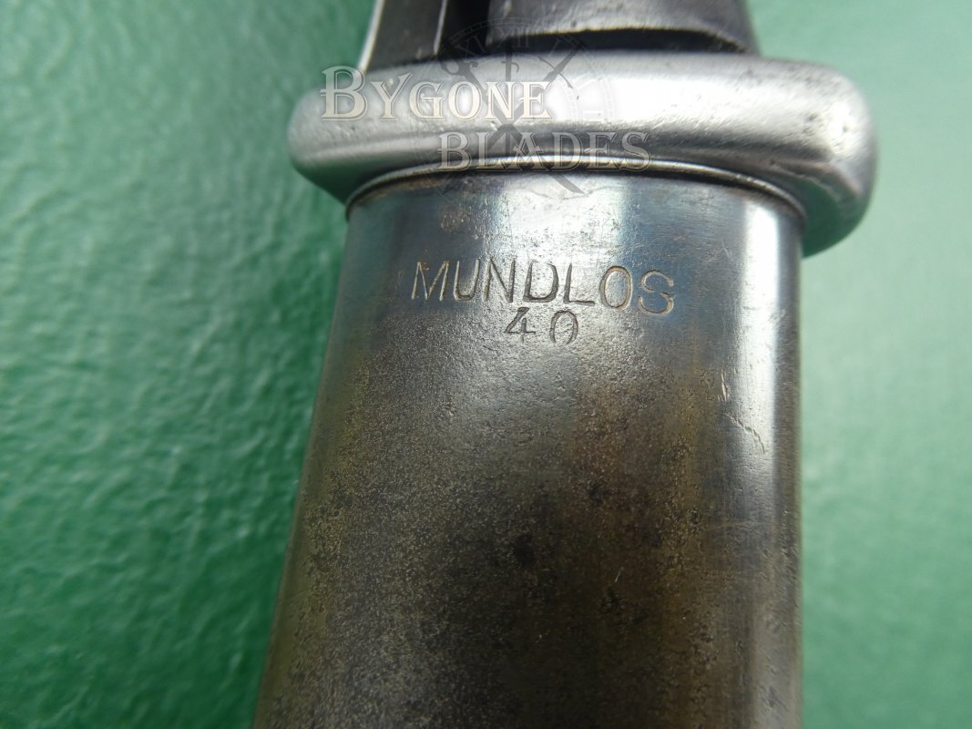 The matching blued steel scabbard is in good condition and is without dents or damage. The front of the scabbard bears a matching number “152” over “a” marked above the frog stud. The back is marked at the top with the maker’s mark, “Mundlos” and the date “40.”.