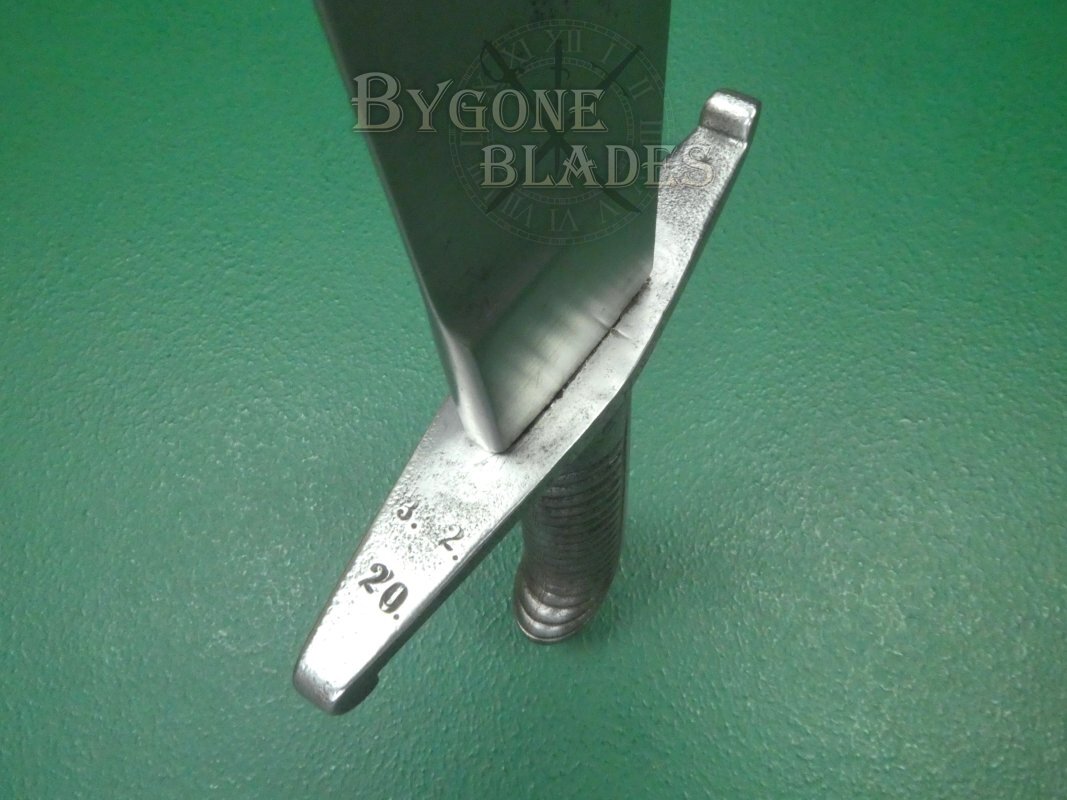 The steel crosspiece bears the unit mark: 123.R.H.156. This unit marking is repeated on the frog stud of the scabbard. The front of the crosspiece is stamped 3.2.20. The obverse of the crosspiece bears the numeral 89.