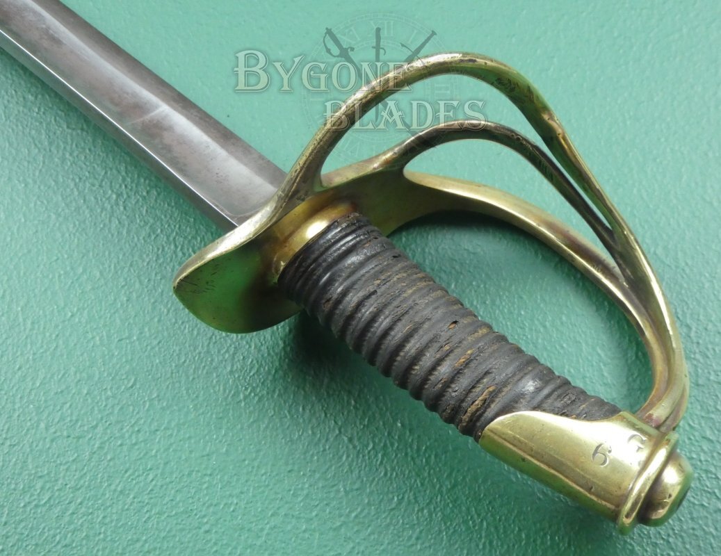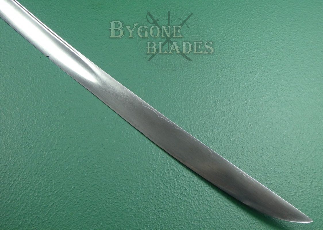 The 900mm single-edged blade has a pronounced curve with a flat wide spine that dates it to pre-1860. The 1860 model having a rounded spine. The blade has a long, wide fuller below a second, thin fuller in the style known as “Montmornecy.” The blade has been service sharpened and retains a fighting edge with a single edge nick and a deep scratch along the upper false edge. There are faint patches of pale tarnish and the blade is otherwise in excellent condition.