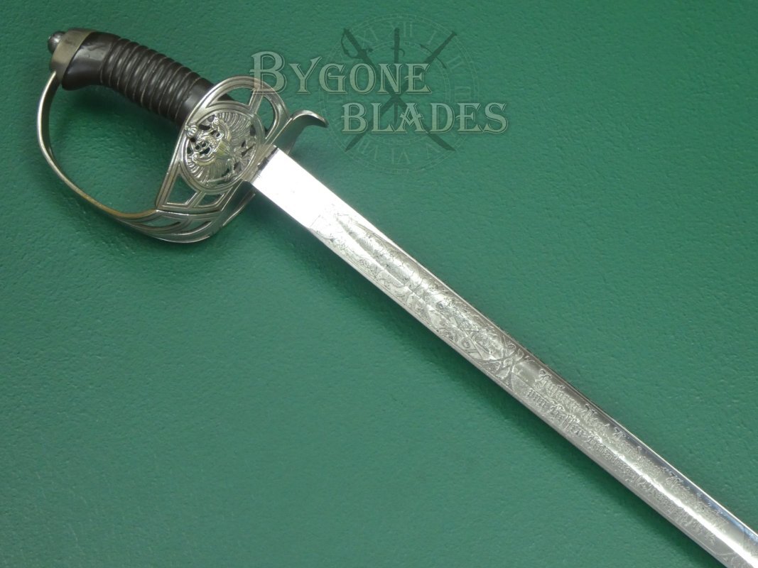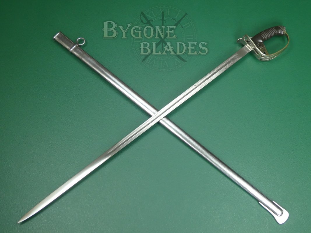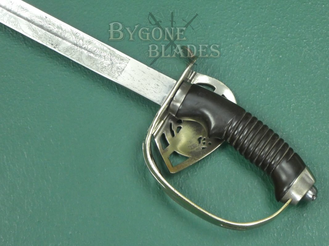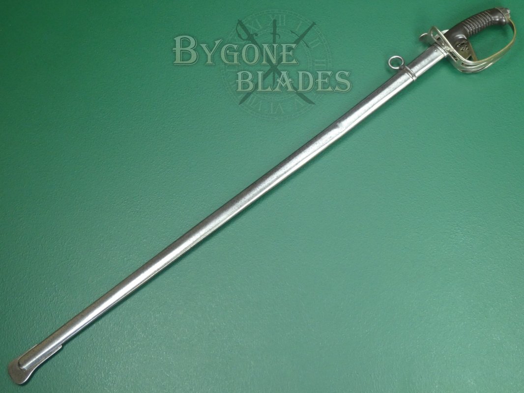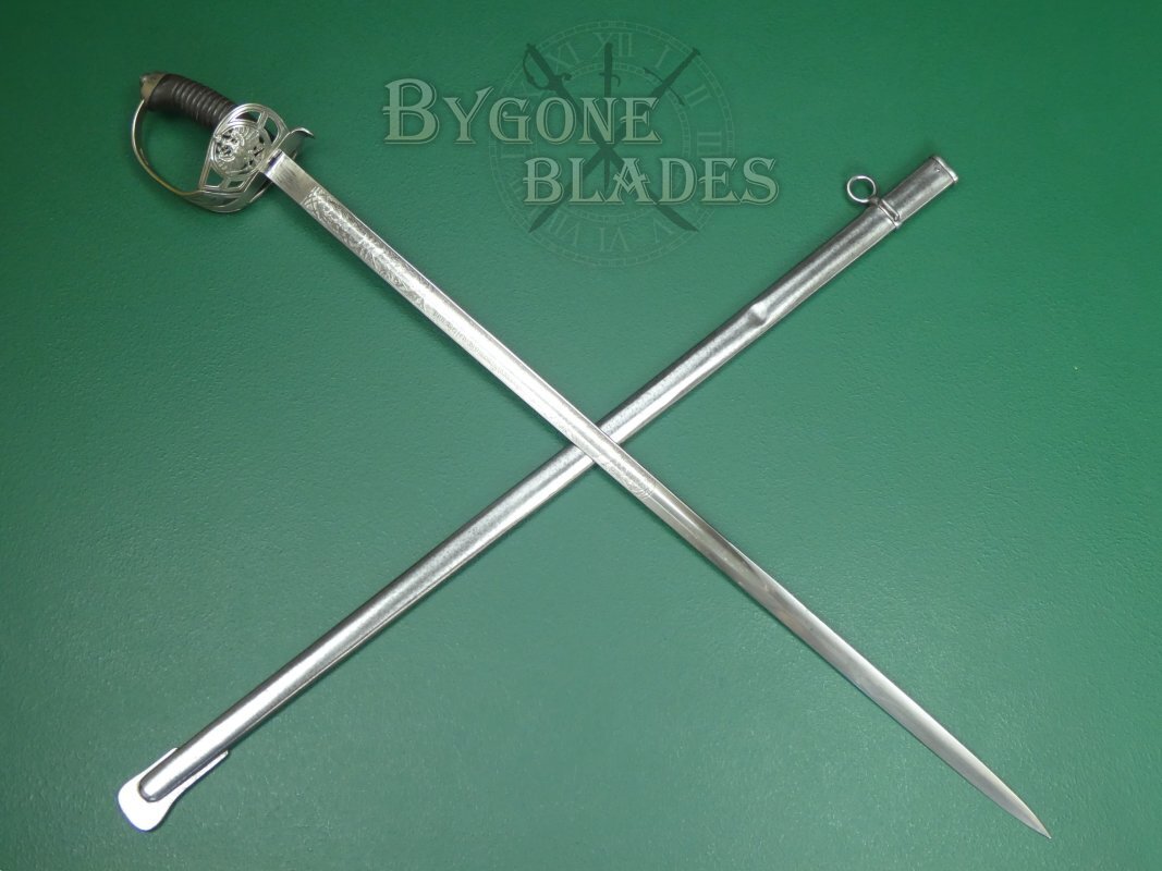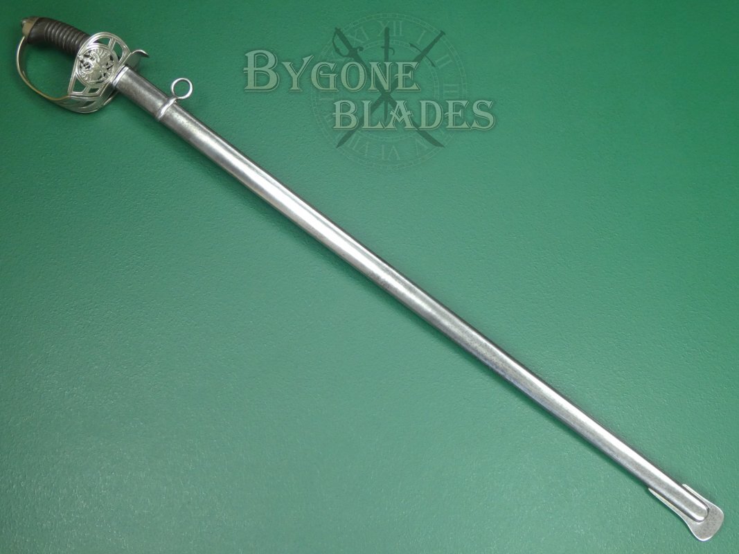 The sword is complete with its original plated steel scabbard with a fixed suspension ring and bar. The scabbard is in good condition with one small ding and a speckled patina. The sword sheathes and draws smoothly and is held firmly within the scabbard.