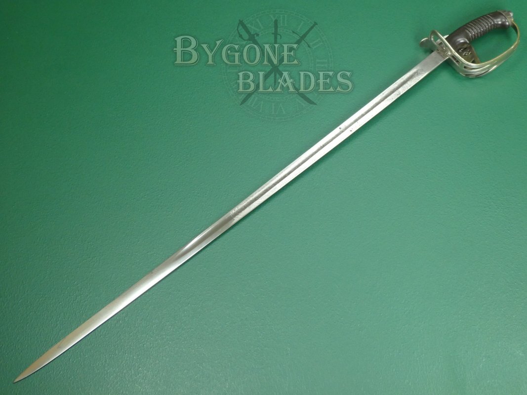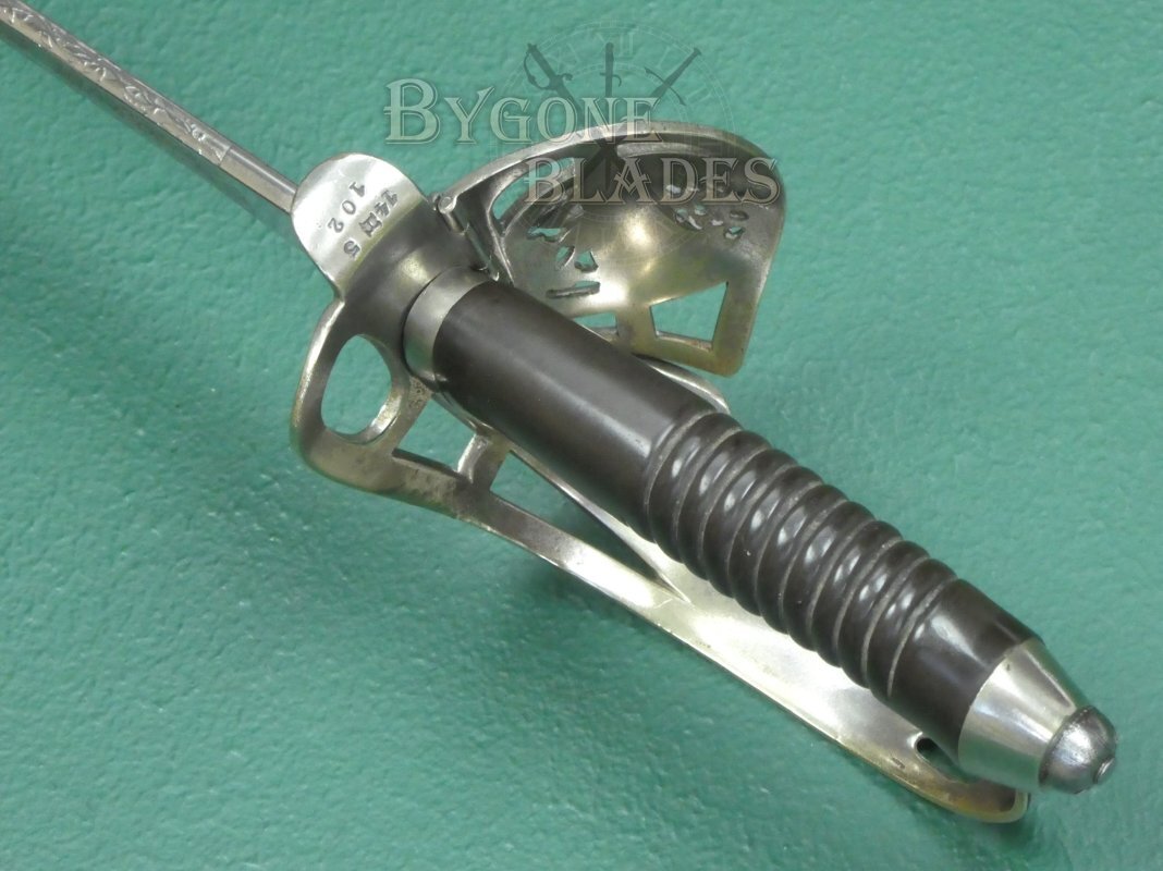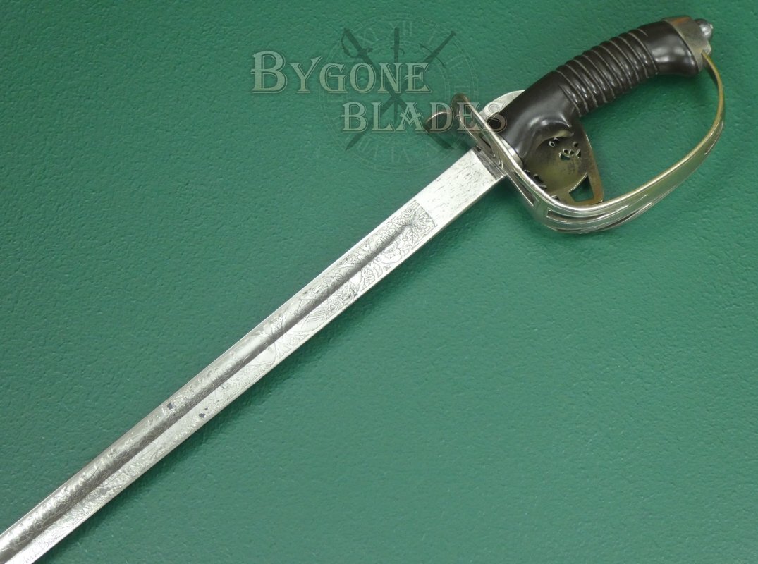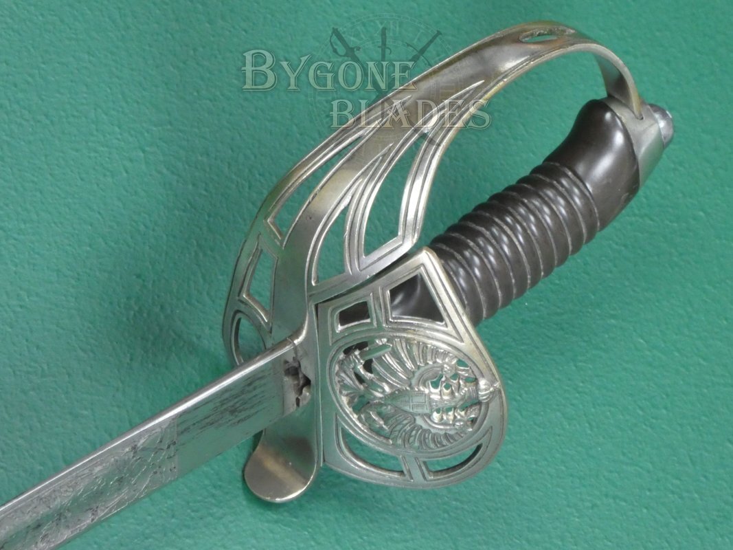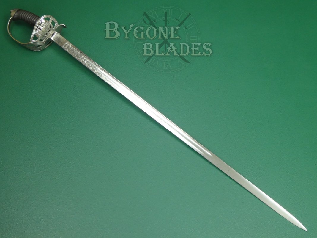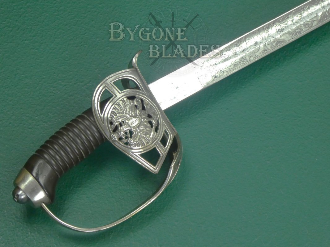 The sword is complete with its original plated steel scabbard with a fixed suspension ring and bar. The scabbard is in good condition with one small ding and a speckled patina. The sword sheathes and draws smoothly and is held firmly within the scabbard.