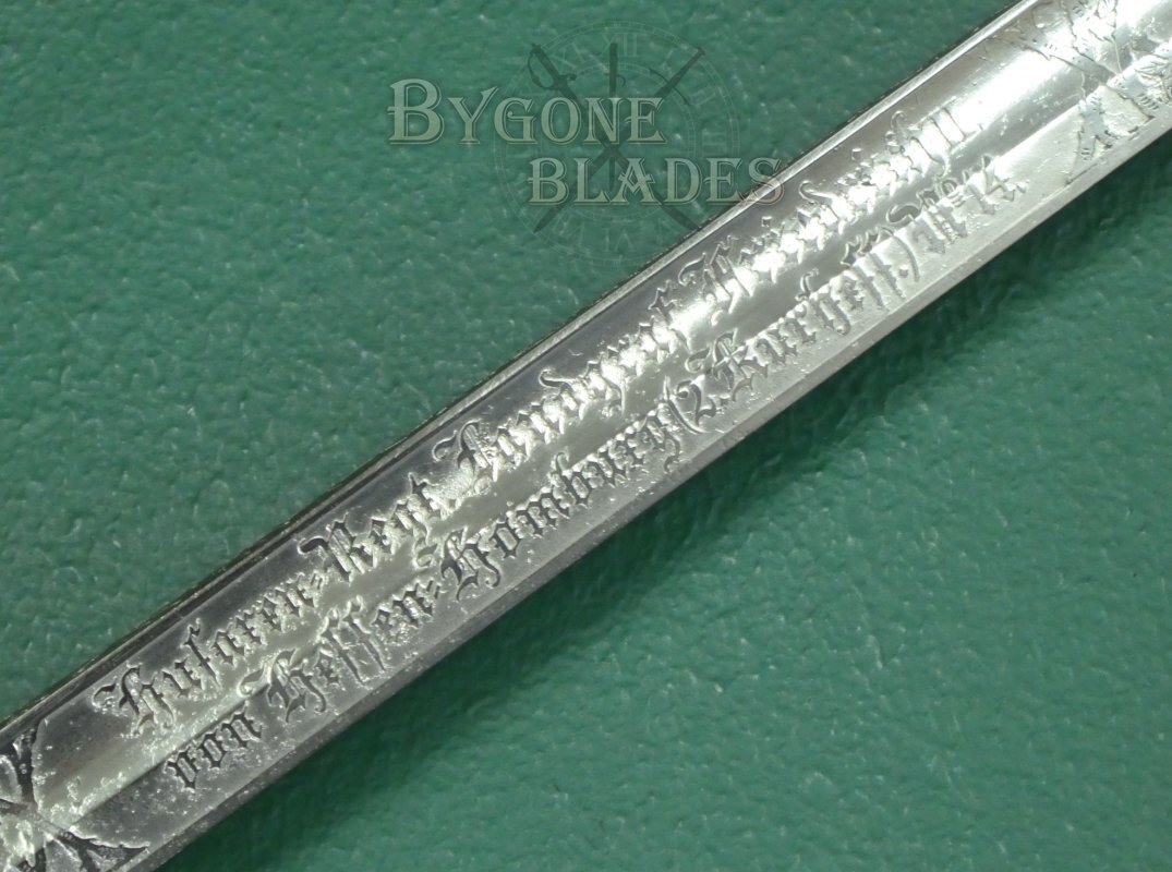 The blade is beautifully etched with roses and a trophy of arms, followed by a panel containing the regimental designation “Husaren-Regiment Landgraf Friedrich II von Hessen-Homburg (2. Kurchessisches) Sr. 14.”