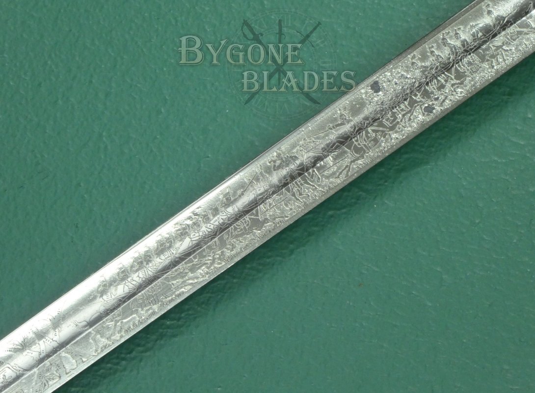 The obverse is etched with intertwined roses, a scene of a cavalry charge and the Prussian coat of arms and royal cypher of Friedrich II. The blade is in good condition with some small spots of tarnish and is unsharpened.