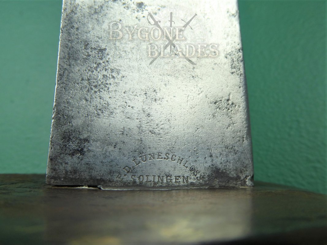 The base of the blade is stamped with the maker’s details, “P. D. Luneschloss. Solingen.” The spine is stamped with a Crown over FW (Wilhelm I who reigned from 1861-1888) and the date stamp, ’61 (1861) above King Wilhelm’s royal cypher.