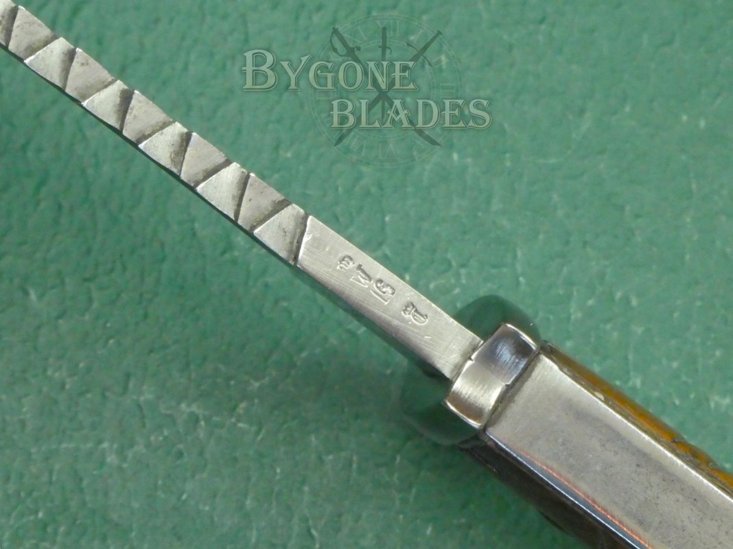 The 367mm blade is in near mint condition. The 29 pairs of saw teeth remain very sharp. The ricasso is stamped with the makers’ details, Alex Coppel, Solingen. The spine bears the date stamp “16” and a crown over the letter “W” (Kaiser Wilhelm) and an inspection stamp. The obverse spine is stamped with the letter H.