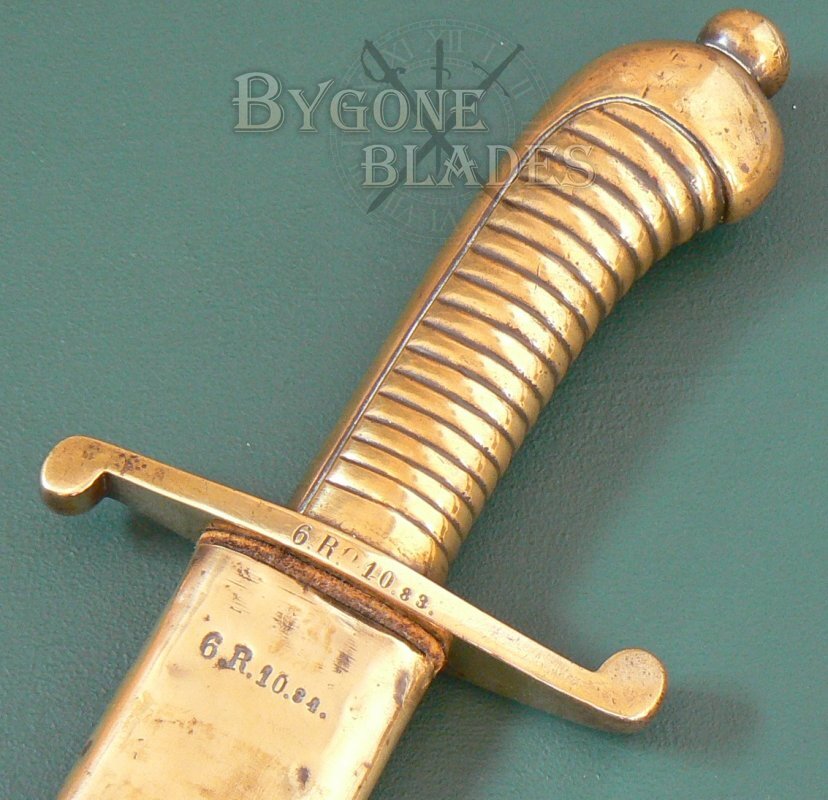 The ribbed brass hilt has a flat crosspiece with button finials. The crosspiece bears the unit marking of the 6th Saxon Infantry regiment.