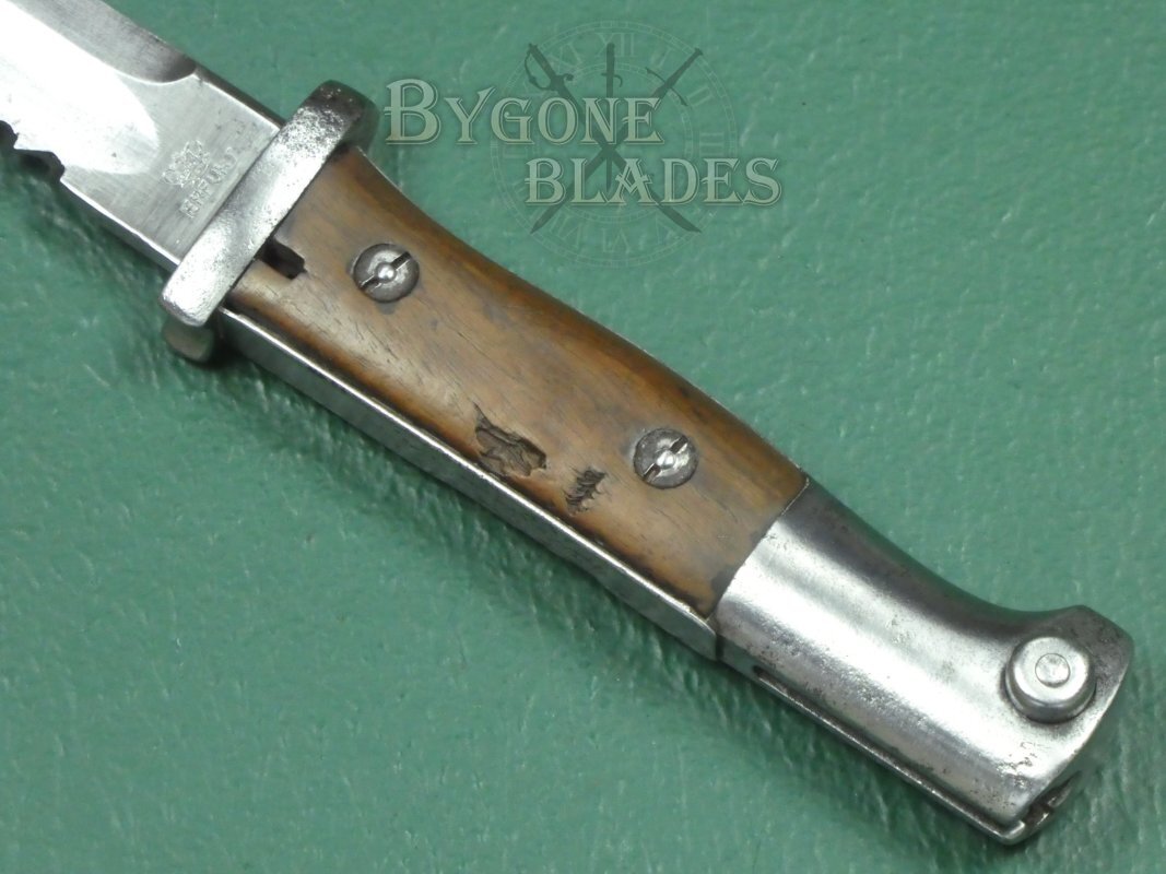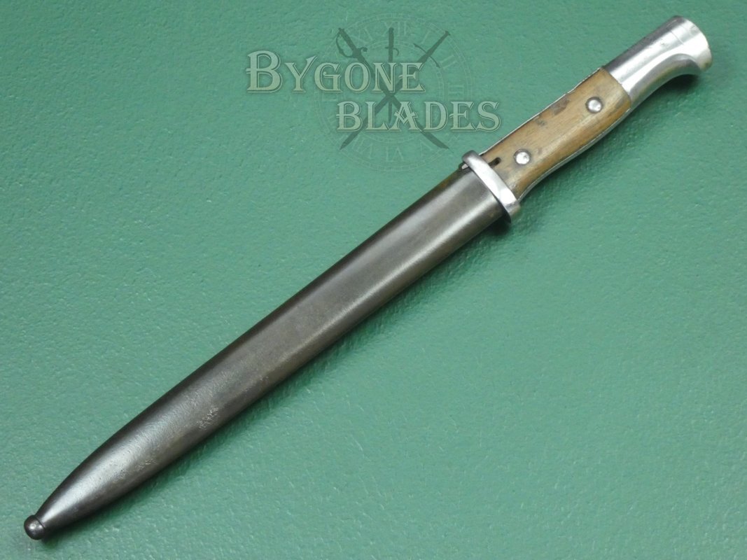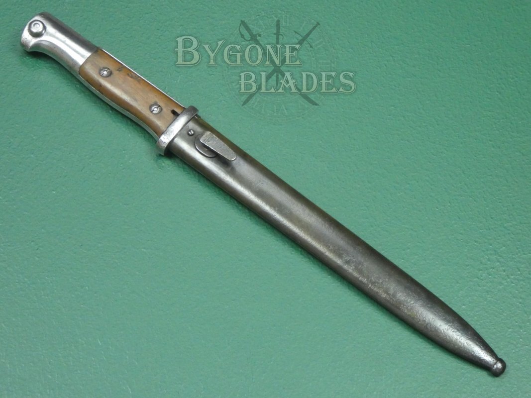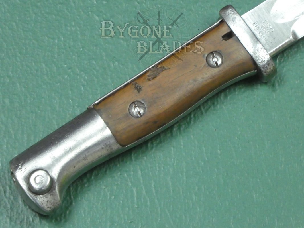 This scarce, double-marked World War 1, German S1884/98 nA sawback bayonet was made in 1915 by Gebruder Heller of Marienthal and is also marked by the Imperial armoury at Erfurt. The second pattern of the 1884/98 knife bayonet was used with the Mauser Gewehr 98 and K98 rifles.