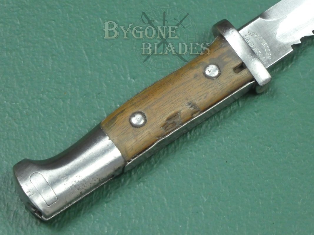 The polished steel pommel bears two crowned inspection marks. A flash protector was added to the back of the grip to avoid the wooden scales being scorched by the rifle’s muzzle flash. The press-stud mechanism is in good working order and the wooden scales are in good condition with age and use related chips and wear. The chips to the grip correspond to dings on the flash guard, suggesting that the hilt was used as a hammer at one time.