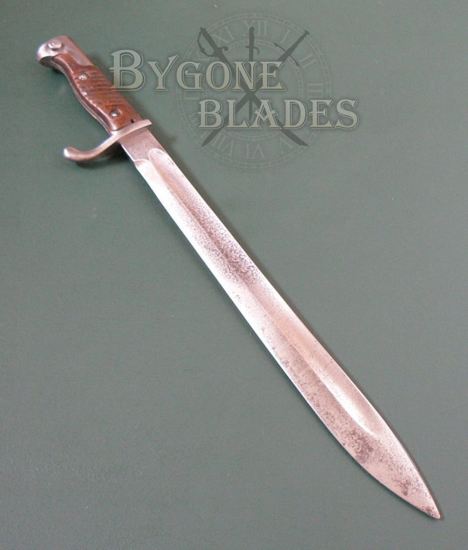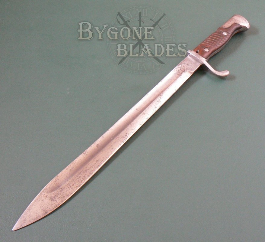 The 368mm single edged blade has a broad single fuller on both sides, below a flat spine with false upper edge. The blade flares before tapering to a spear point. The edge has been factory sharpened. The blade is in fair condition with scattered shallow pitting and is bright and free from active rust.