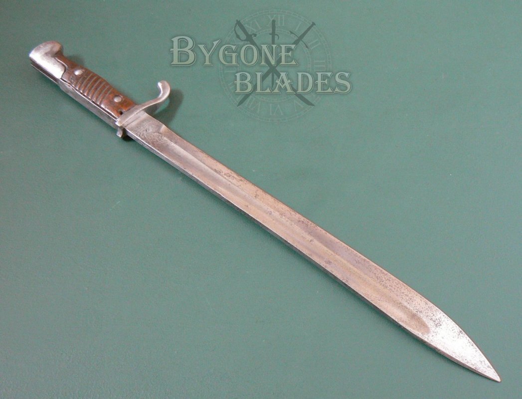 The ricasso is stamped with the worn maker mark, “Schubert und Salzer Maschinenfabrik, Chemnitz.” The S98/05 was the only bayonet produced by this company. It was produced from 1916 to 1917.
