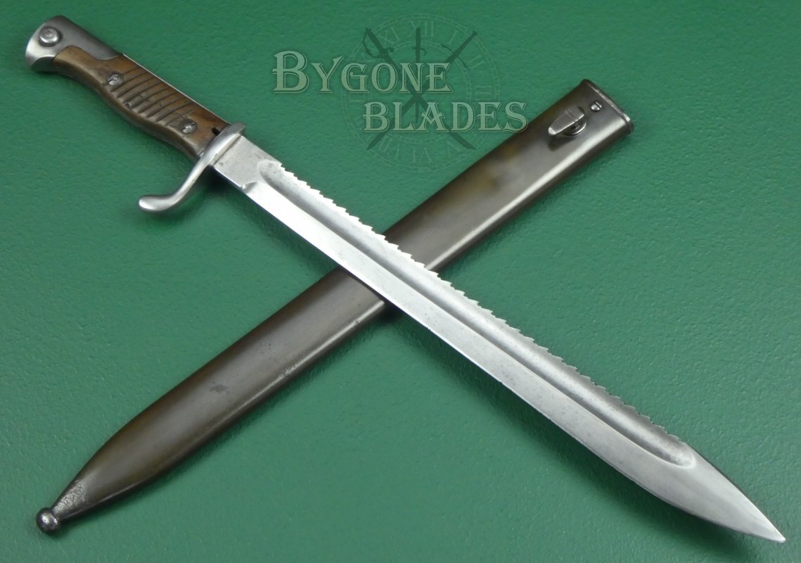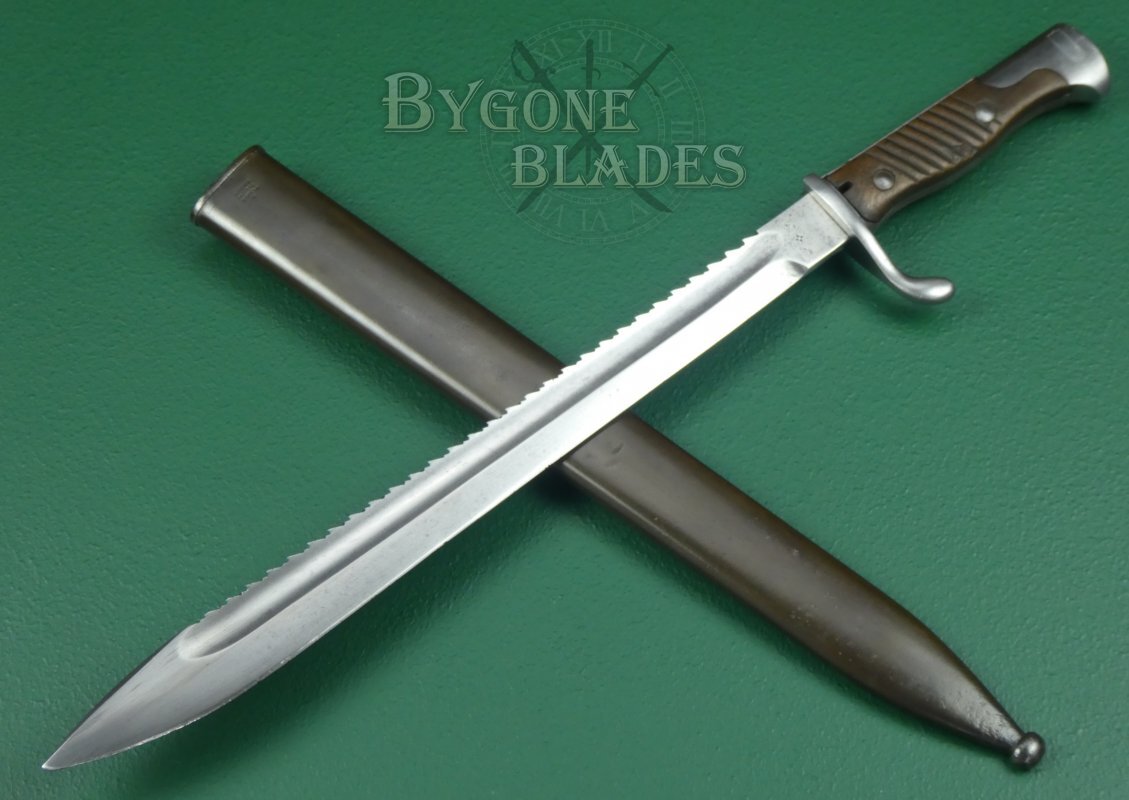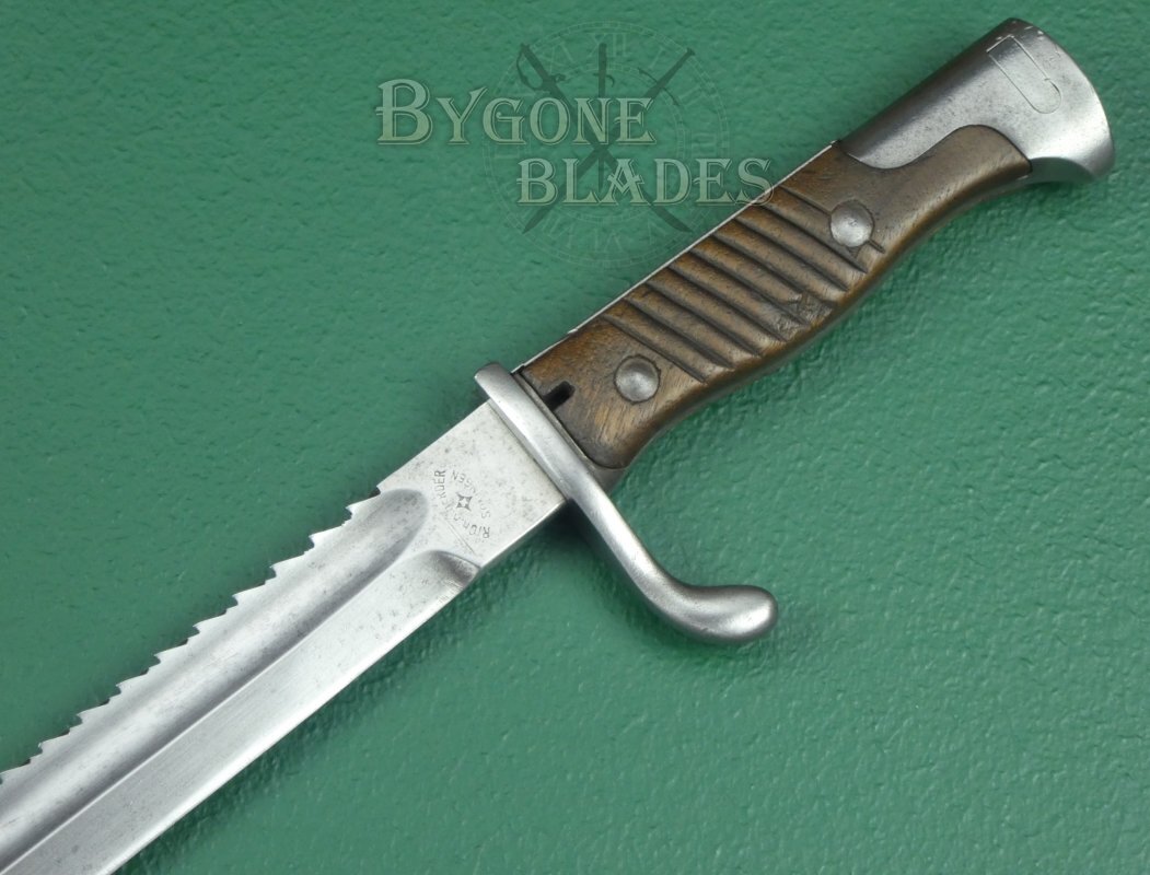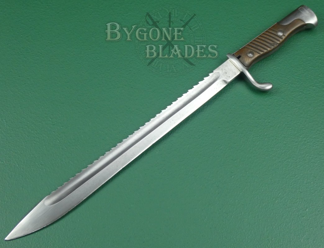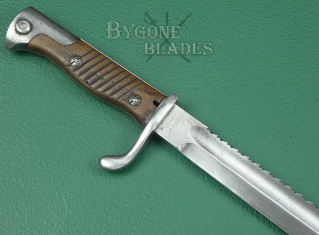 Rare double maker marked German WW1 S98/05 m.S. Saw-back “Butcher’s Blade” Bayonet. The saw back version of the S98/05 bayonet was known as the S98/05 m.S. (mit Säge - with saw). Only 6% of S98/05 bayonets were made with the saw back. This S98/05 m.S was made in 1917, and would have been one of the last produced.