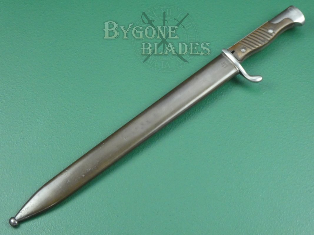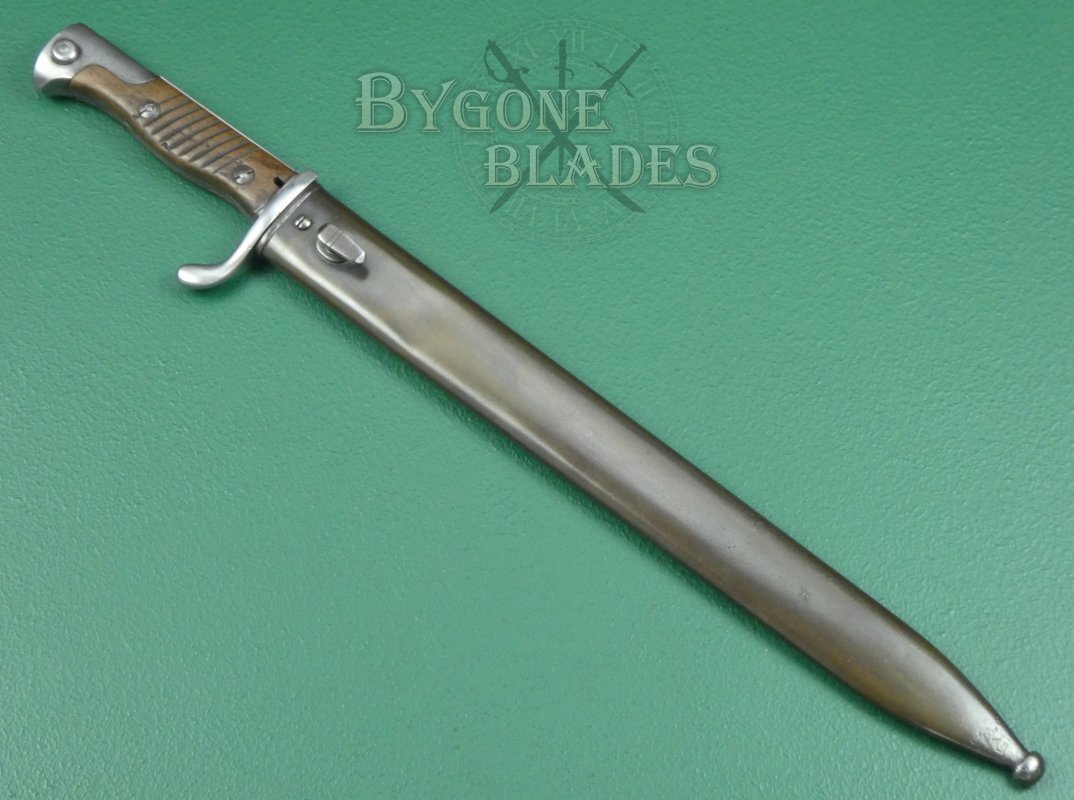 The bayonet is complete with its steel scabbard. The scabbard is in very good condition and retains its original black finish. The top of the scabbard is stamped with the makers’ details, Waffenfabrik Mauser. AG. Oberndorf. A.N. The bayonet draws and sheathes smoothly and is held firmly within the scabbard.