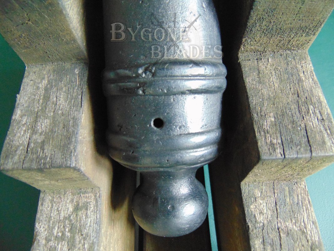 The 345mm long barrel has three reinforcing rings and two double rings fore and aft of the vent field. The barrel is 66mm wide at the cascable. The vent and bore are open.