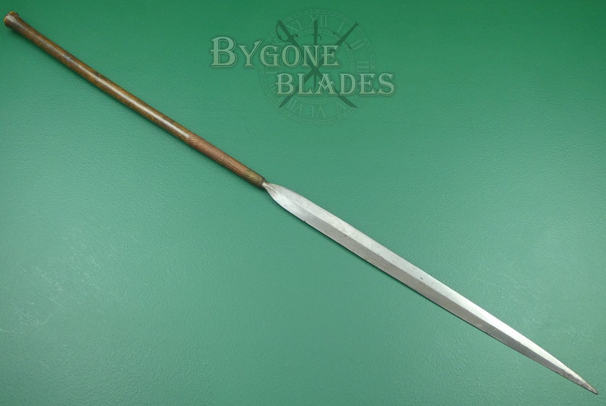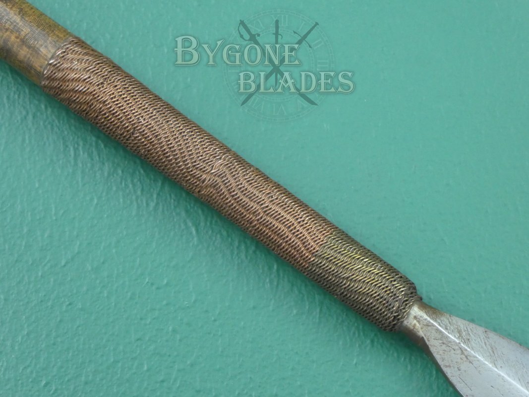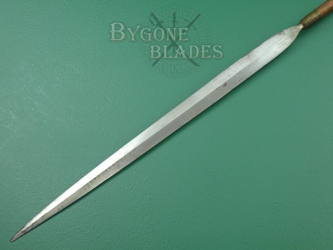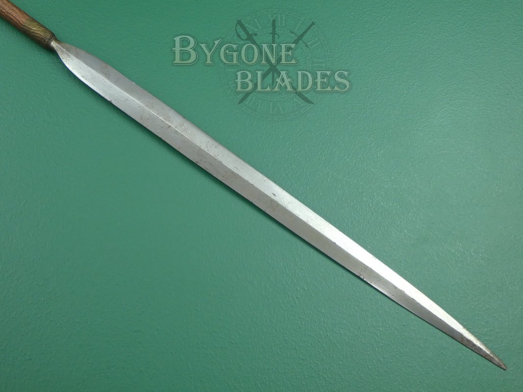 The incredibly long 588mm hand forged blade has a flattened diamond section with raised medial ridge. The blade is 35mm at its widest and is in great condition.
